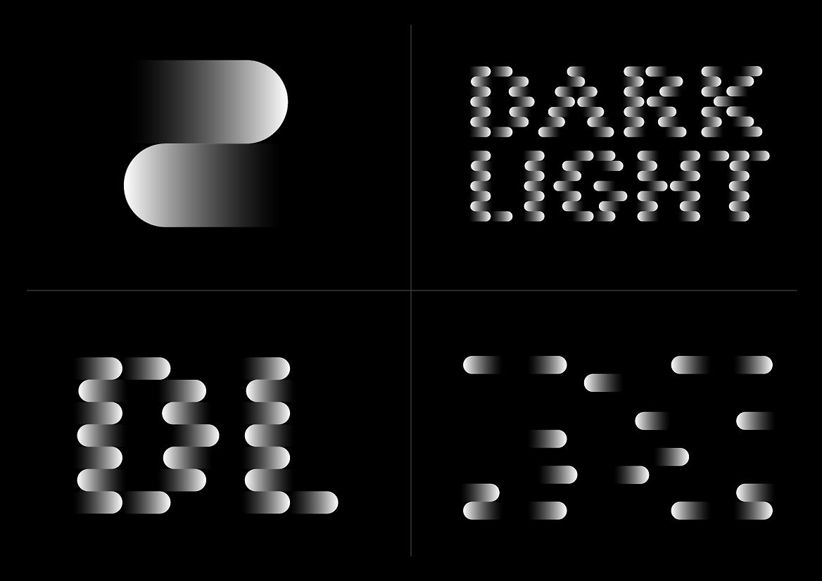 This symbol became the unit used to create the Darklight wordmark. A rather distinctive wordmark that aims to capture the magic of light and sound in letters. Transitioning in and out of itself and its surroundings.