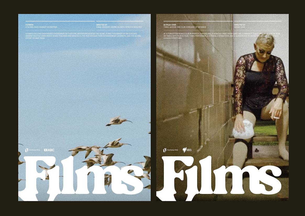 From applying for Government grants to onscreen applications, the wordmark references the five founders and their connected approach to filmmaking. Letterforms merge into one another, symbolising collaboration, while the shortened logo uses the “F”s in Five and Films to form the “S” in Storey at the heart of the brand - creating depth, projection and a strong visual signature that tells its own story. Designed to balance institutional clarity with creative depth, the identity had to perform across a range of touchpoints, from on-screen to detailed documents, film posters to treatment decks. It needed to carry the weight of professionalism in government-facing spaces while maintaining the creative spirit of the filmmaking team. The stacked nature of the wordmark allows for dynamic use across layouts through cropping, and motion, creating ownable brand moments that can stretch across formats without losing clarity, while highlighting Five, Storey, and Films.