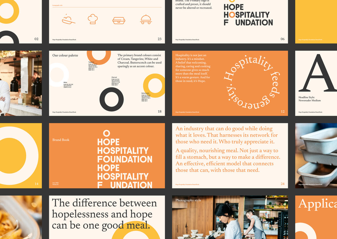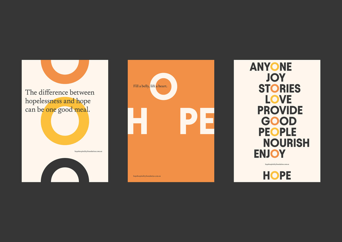 This idea translated into a dynamic, energetic visual expression to support the Hope Hospitality Foundation’s mission via a positive, confident brand identity featuring multiple dishes as a core element of the visual expression.