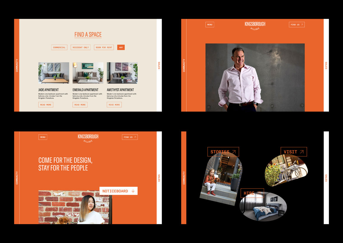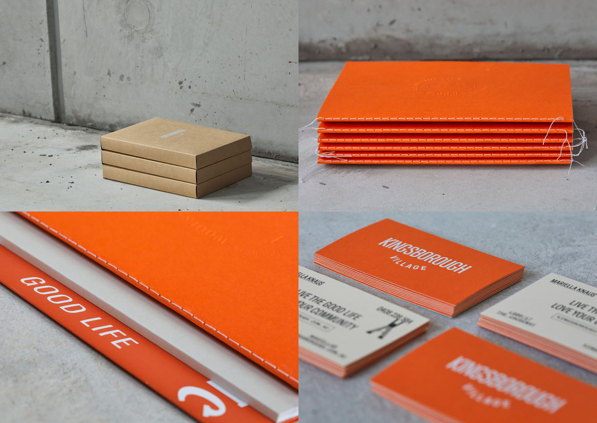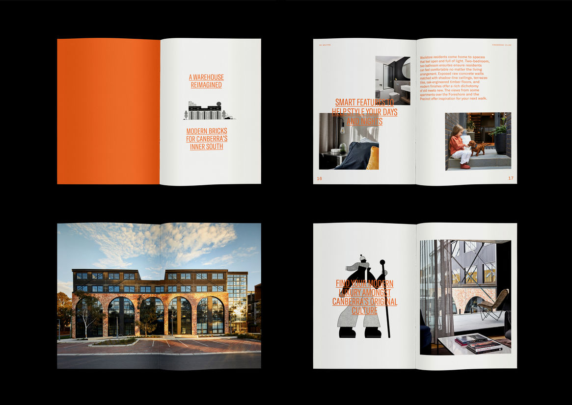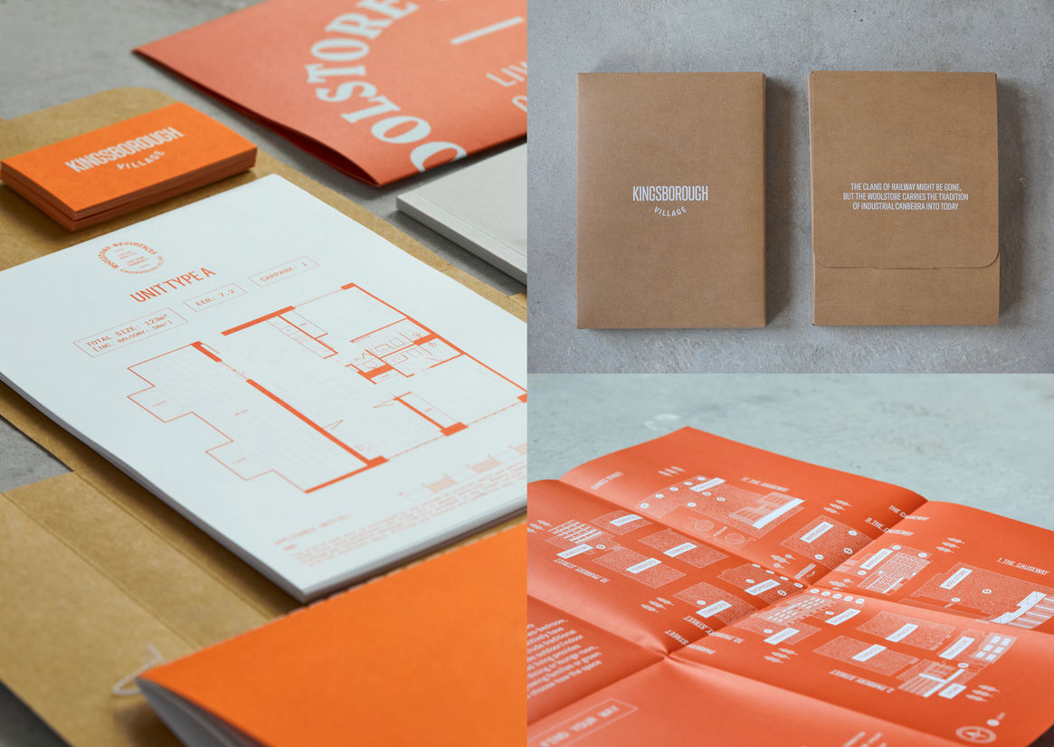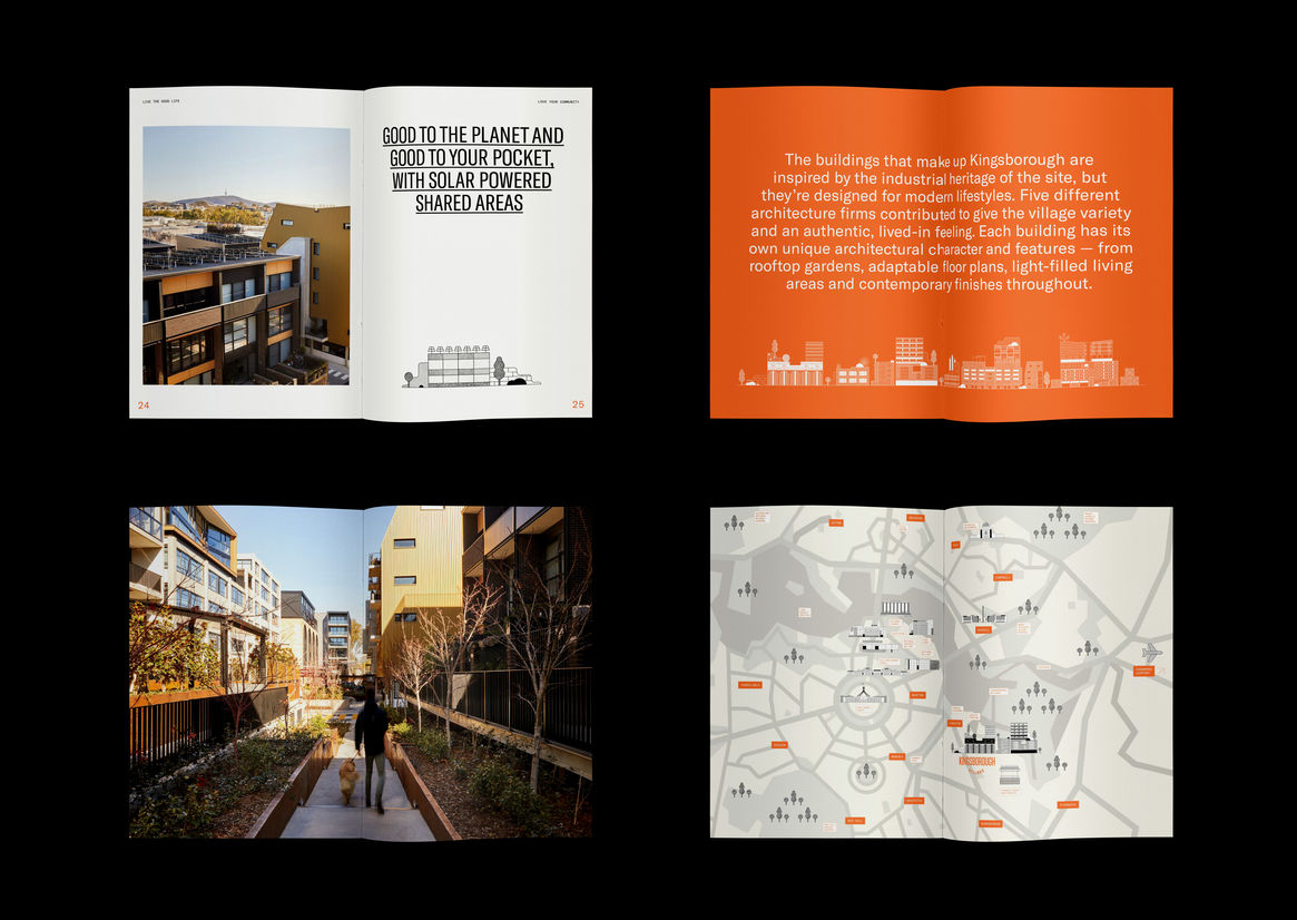 The logotype’s shape is designed to resemble a ‘smile’, representing the positive, happy community who live there. The brand has a unique personality which is brought to life through quirky illustrations and characters who represent the variety of people within the community. The diversity of the characters increases the sense of belonging as each individual resident can feel like they are included in the wider Kingsborough community. The brand’s tone of voice is bright and personable, immersing the audience in sensory language which is complemented by crisp photography. The warm burnt orange and off-white colour palette is reminiscent of Canberra’s red-brick heritage. The collaboration between the old and new, as inspired by the architecture, is extended to physical collateral which features raw uncoated paper finishes, stitching and foil printing. Brand elements are brought together to appeal to a wide demographic, offering an authentic, people-driven approach to property development.