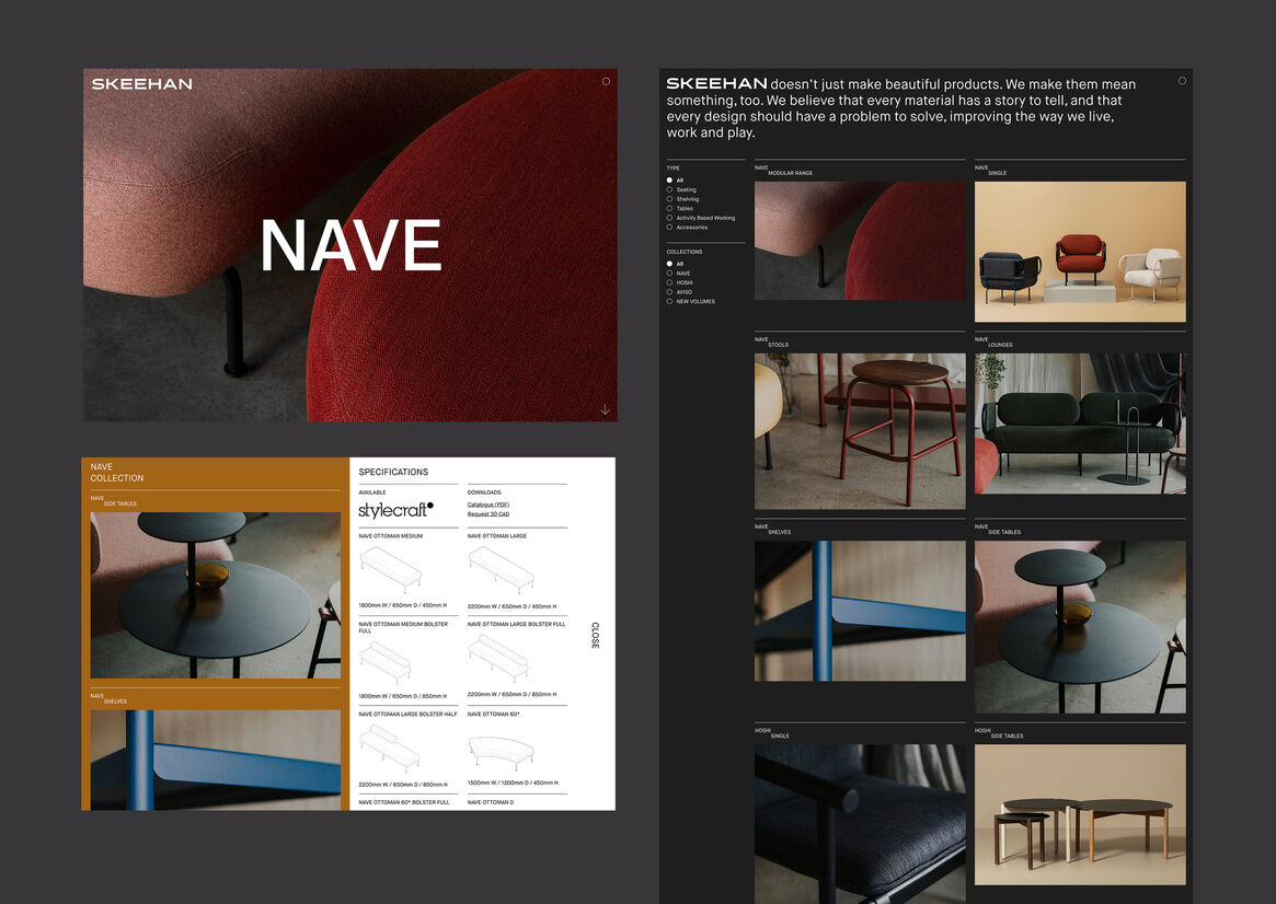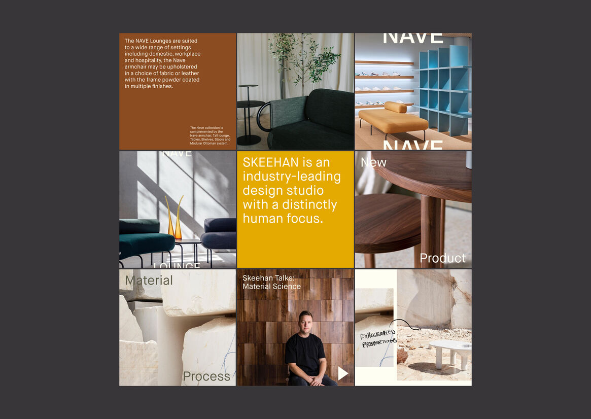 SKEEHAN is an Australian design studio specialising in high-end furniture and designs for commercial environments. The purpose of this project was to reposition the brand to reflect an evolving team, express the diversity of their projects, encourage collaboration and communicate the value of their offerings to the Australian-made market. Paramount to the brand’s success is their ability to effectively communicate to prospective clientele their vision to reconnect people to the material world around them. The devised strategy sought to emphasise innovation and partnerships, encourage engagement across brand touchpoints and facilitate collaboration between designer and client throughout various phases of product development.