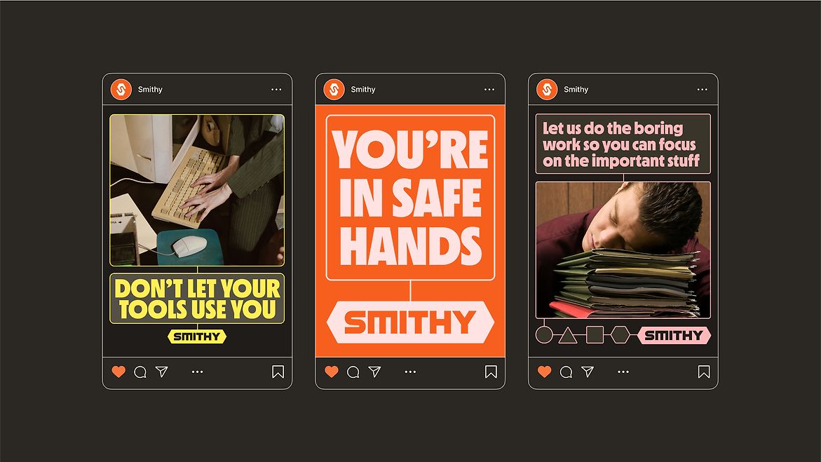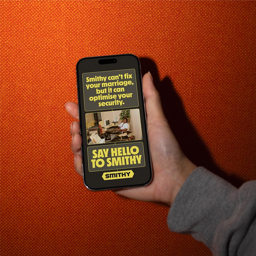 The new identity flips cybersecurity’s corporate tone on its head. Bold visuals, a playful tone of voice, and AI-generated Y2K-era imagery of stressed-out IT teams brought humour and nostalgia to an otherwise dry category. Lines like “Smithy won’t save your marriage, but it can optimise your security” made the brand human, relatable, and memorable.