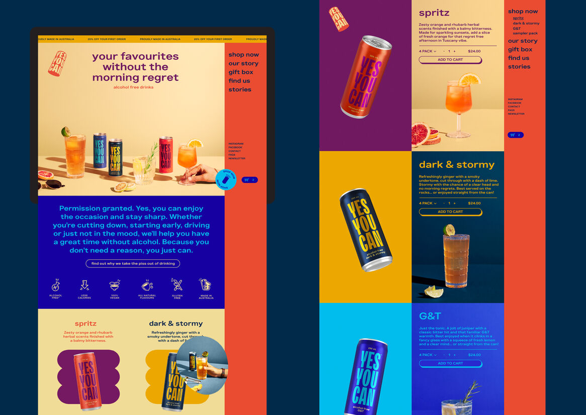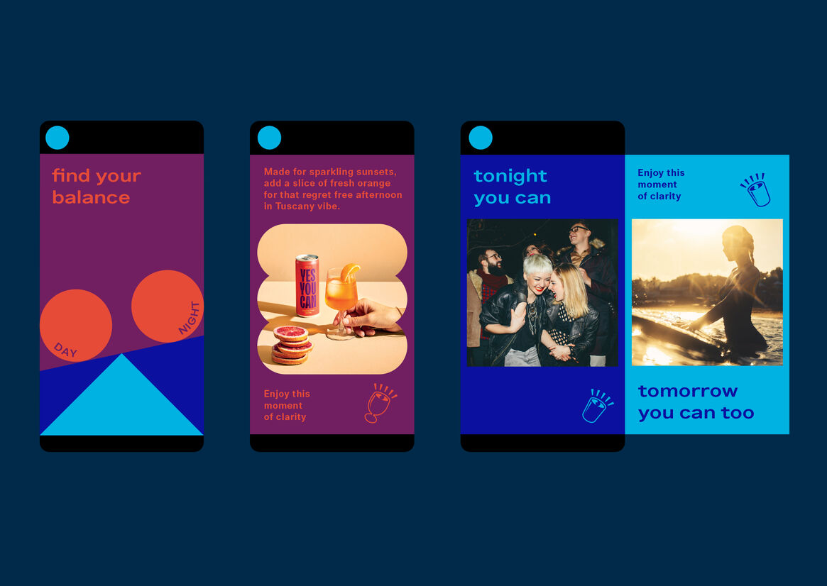 Given the challenge above, and the audience we’re talking to, we established early that Yes You Can was going to be a refreshingly positive, inclusive, and non-judgmental brand. The brand name is a statement of intent, referencing the willpower required to cut down, giving you permission to do your own thing, or if you just want to pace yourself by mixing your drinking with a non-alc breather, now you can.