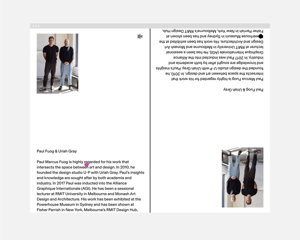 The website layout is intentionally symmetrical, primarily divided into a 50/50 composition. When viewed on desktop, the content on each of the designer’s pages displays and scrolls naturally on the left-hand side and upside down on the right-hand side.