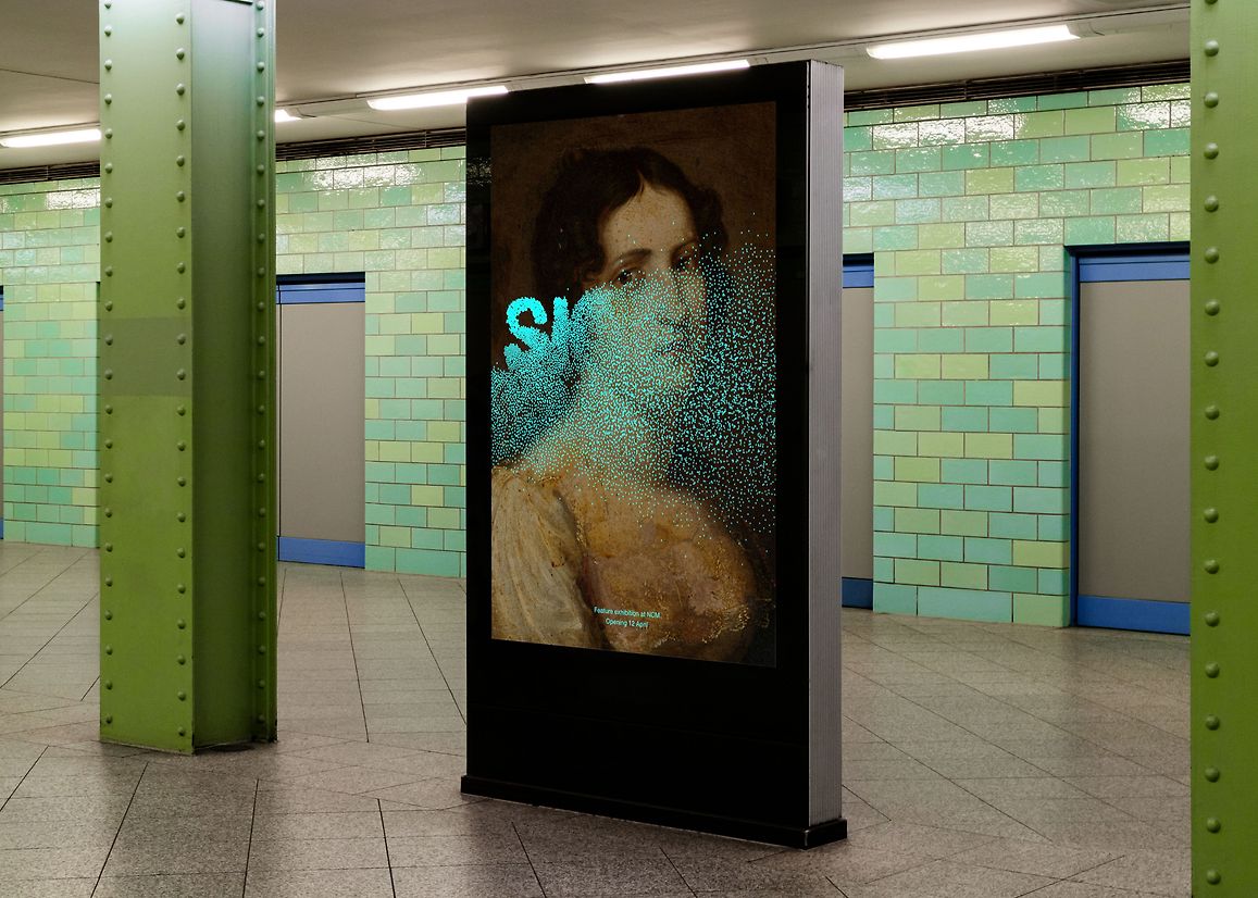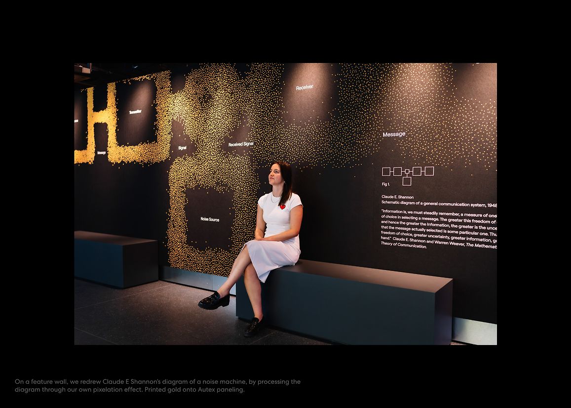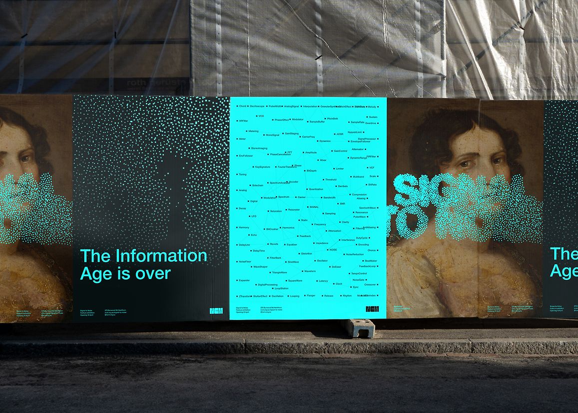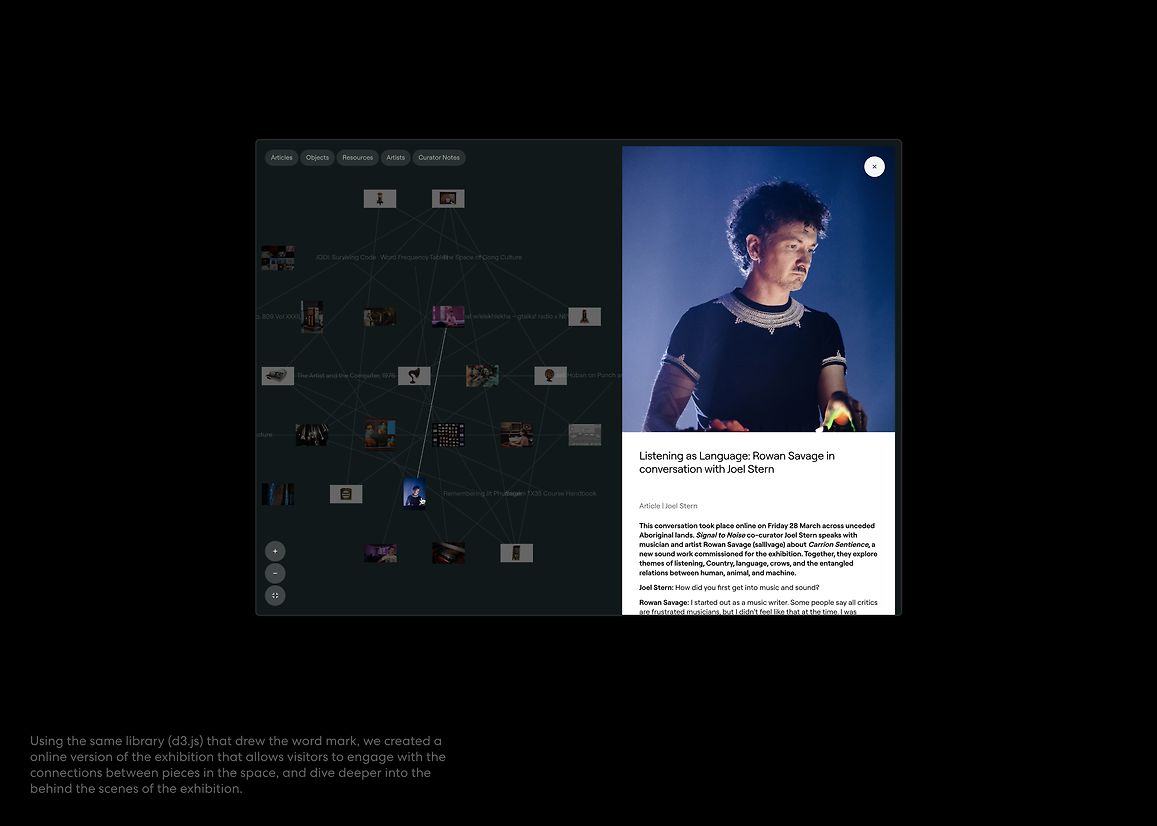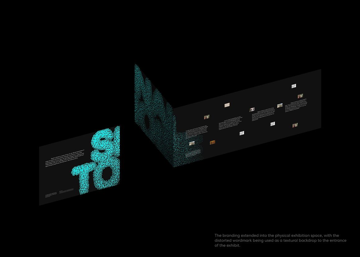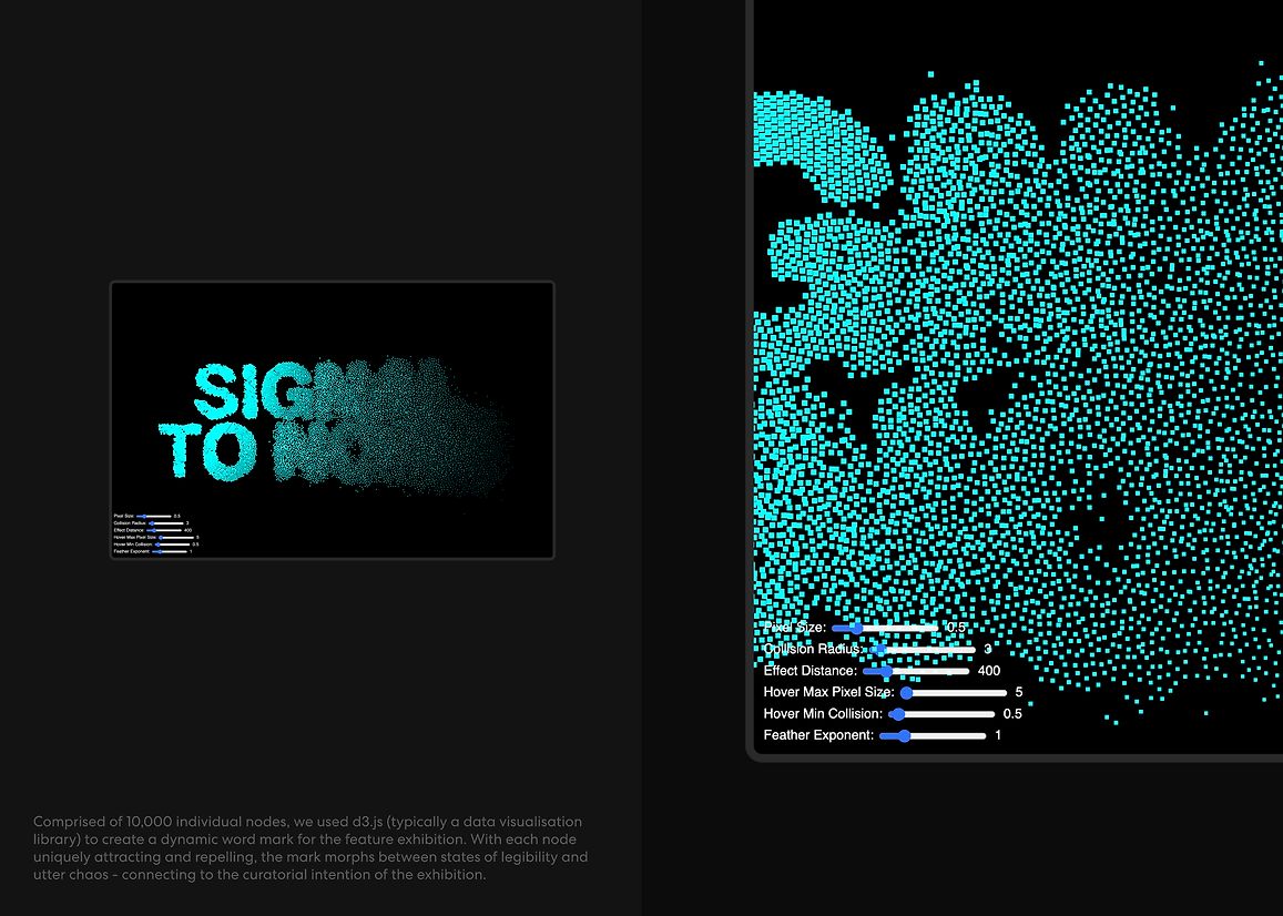 The identity system mirrors these ideas. Rather than a fixed logo, the design team created a generative, ever-evolving mark composed of thousands of animated nodes. Built using d3.js, a tool traditionally used for data visualisation, the mark responds to invisible forces of attraction and repulsion, shifting constantly between coherence and chaos. It’s a living expression of the exhibition’s core tension: the interplay between noise and meaning.