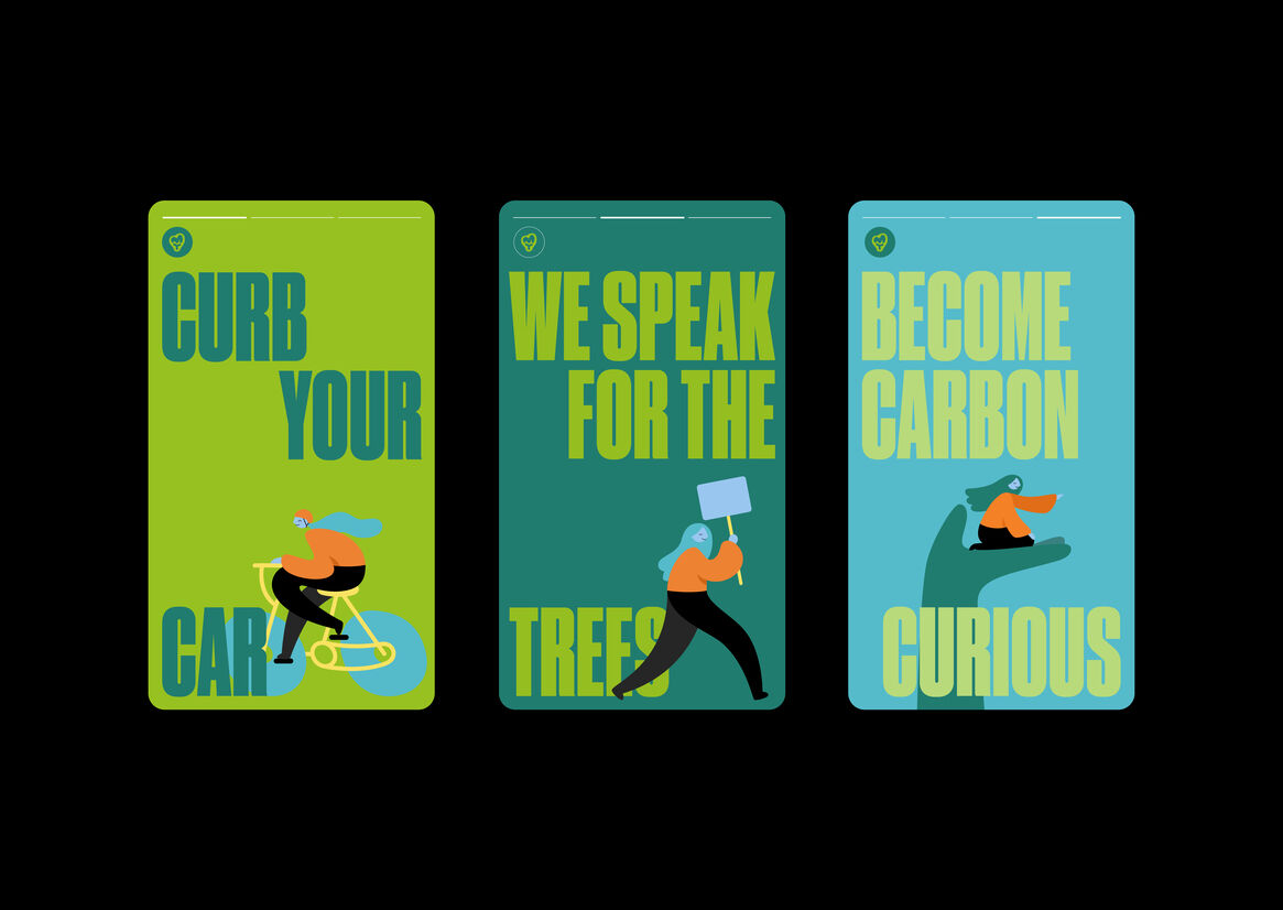 From this, we developed a distinctive organic tree-like symbol representative of natural growth and cloud forms and balanced it with a lower case sans serif (to help moderate any sense of dictatorial authority). The supporting colour palette is unmistakably a facsimile of nature, and our unique human-centric illustrations endorse the idea that reducing and managing carbon emissions should be a process more simplified and more easily assimilated. It is a human story after all.