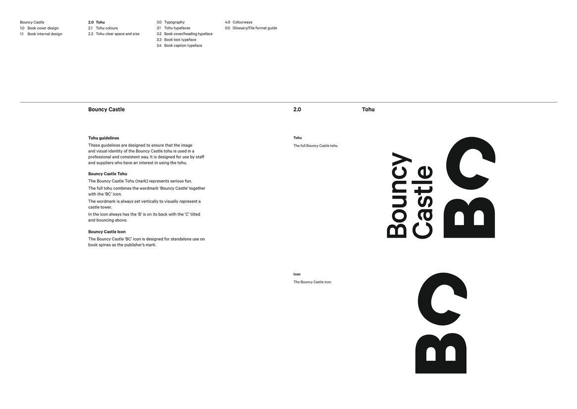 RESPONSE The tohu/mark: The flippant name Bouncy Castle might seem to contradict the imprint’s intent. We adopted the oxymoron ‘serious fun’ as a design guide. We wanted the tohu to be an integrated part of the design system, so built it with a typeface that could be used within the book. Klim Type Foundry’s Calibre was chosen as a serious font that with a little encouragement could also look playful. Turning the ‘B’ on its back and placing the ‘C’ directly above it, and titling it, created the illusion of bouncing—and a perfect, simple monogram for book spines. The full tohu adds the wordmark turned on its end—looking like a small typographic castle. There are no set colourways for the tohu, other than being mostly black or white over a colour ground.