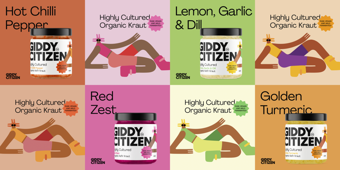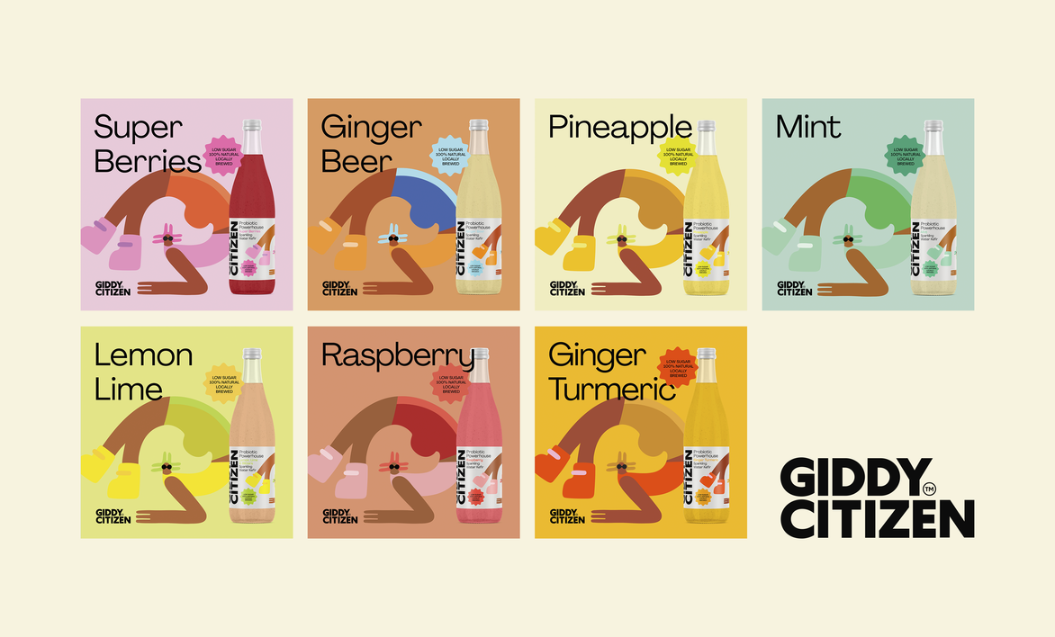 Our design captures the tone of warmth and inclusivity at every touch point, assuring customers their needs are not only understood but positioned at the heart of the giddy citizen offering. With a hero character custom illustrated by Aley Wild, we are presented with a unique, eye-catching mascot for happiness with an infectious spirit to boot. A bold wordmark seeks to match the punch of flavour found in the Giddy Citizen products, with a softness around the edges that feels friendly and inviting. We have delivered a brand that is as comforting as it is exciting, delivering serious results in the silliest way and bringing you back home to the wellness you deserve.