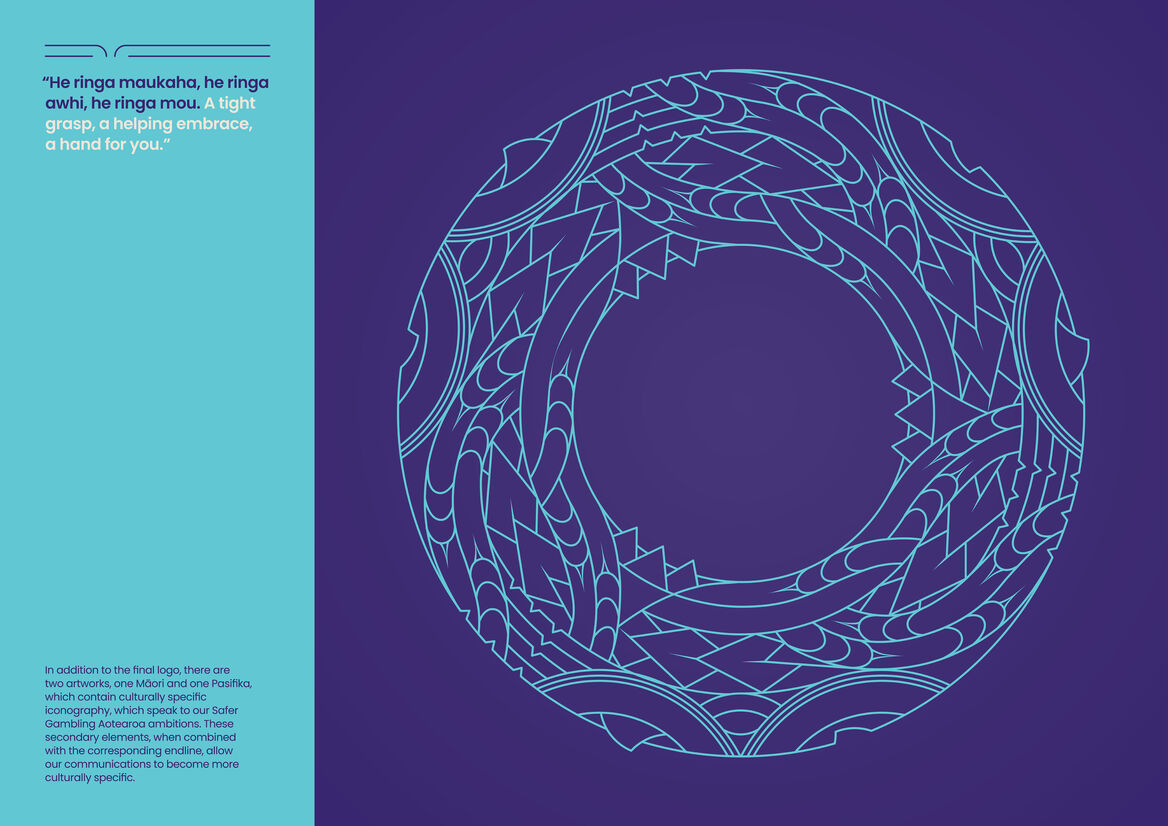 The logo is the centrepiece of the identity and stems from a circular tohu, representing a cycle of activity and the themes of manaaki, strength through adversity, and protection. It also features Te Ringa Akiaki, the helping hands of those who tautoko / support individuals to practise safer ways to gamble – or to completely stop if they choose to. The outer rings with the curved ringa symbolises the continuous mahi of Safer Gambling Aotearoa. The inner rings represent the people we hope to inspire.