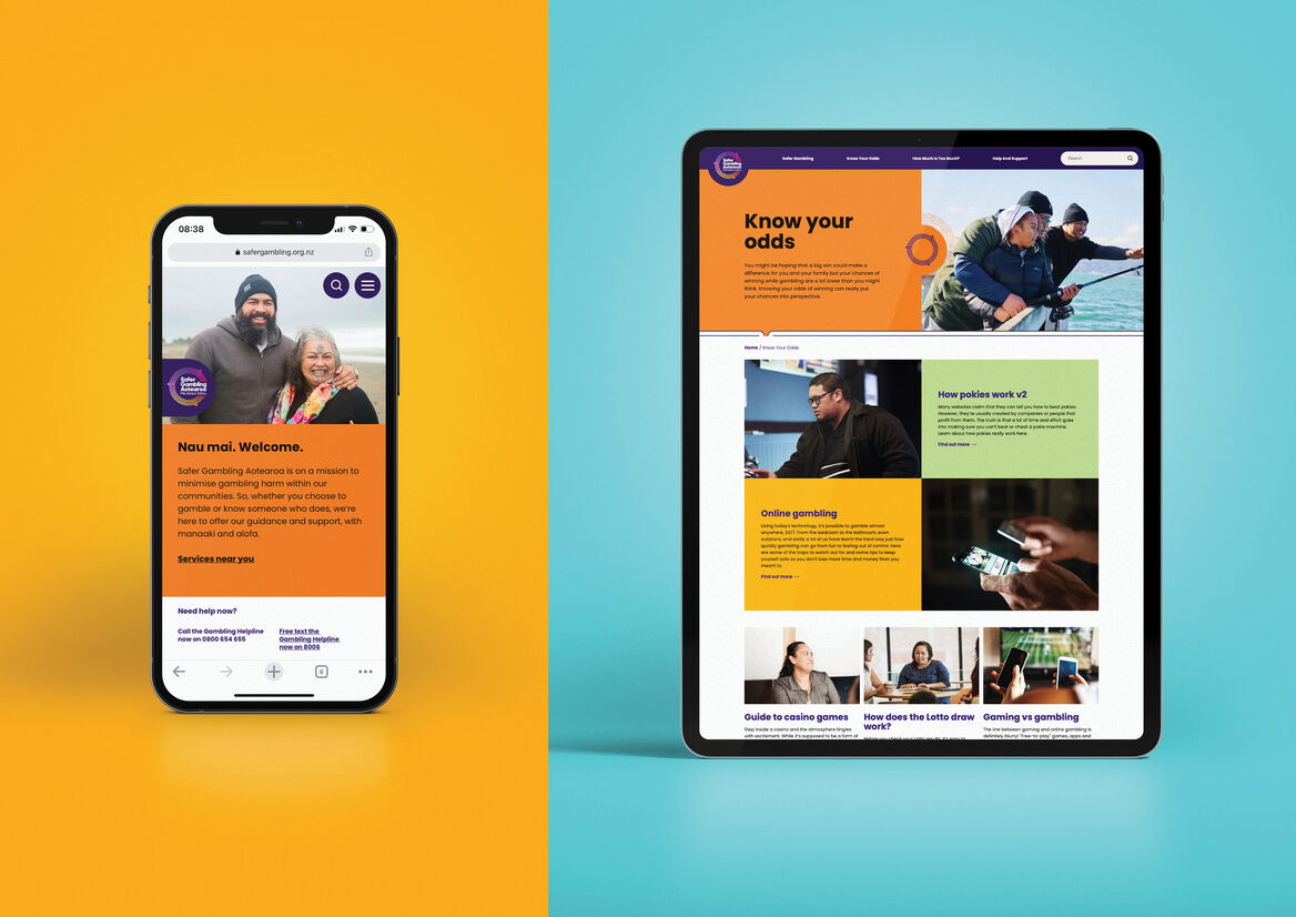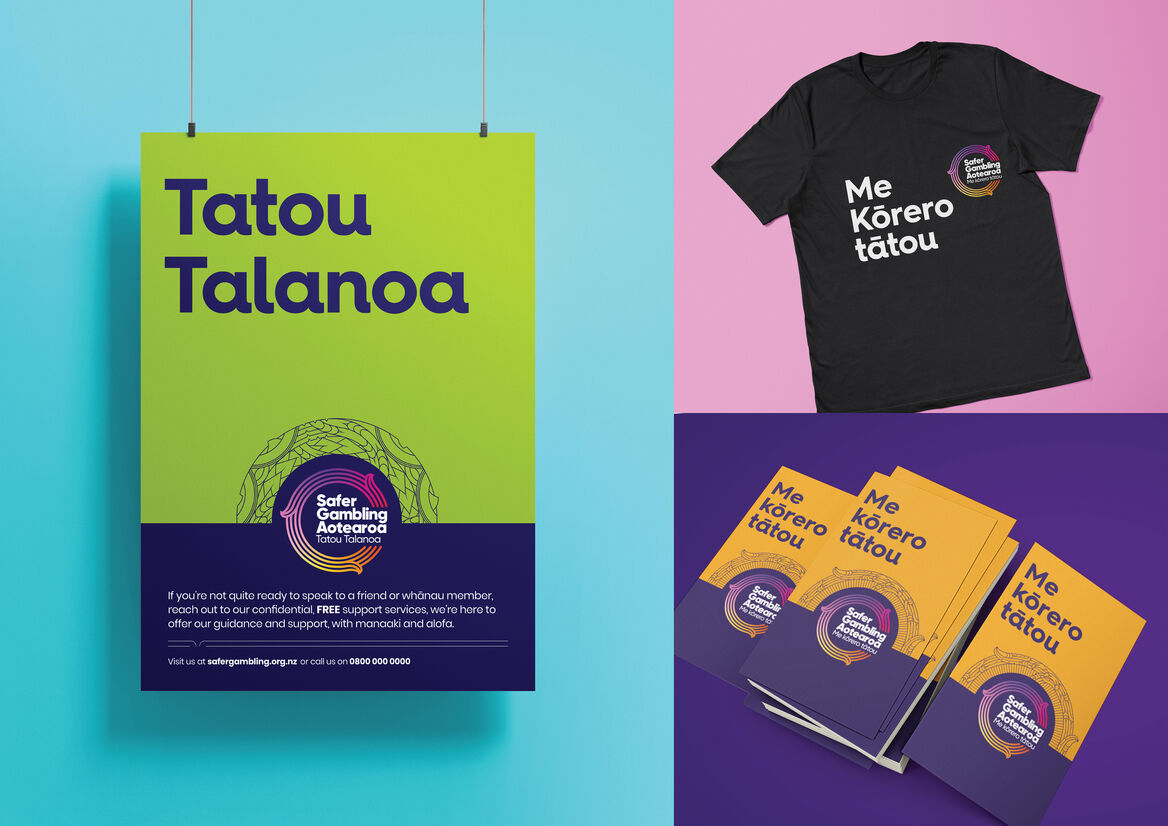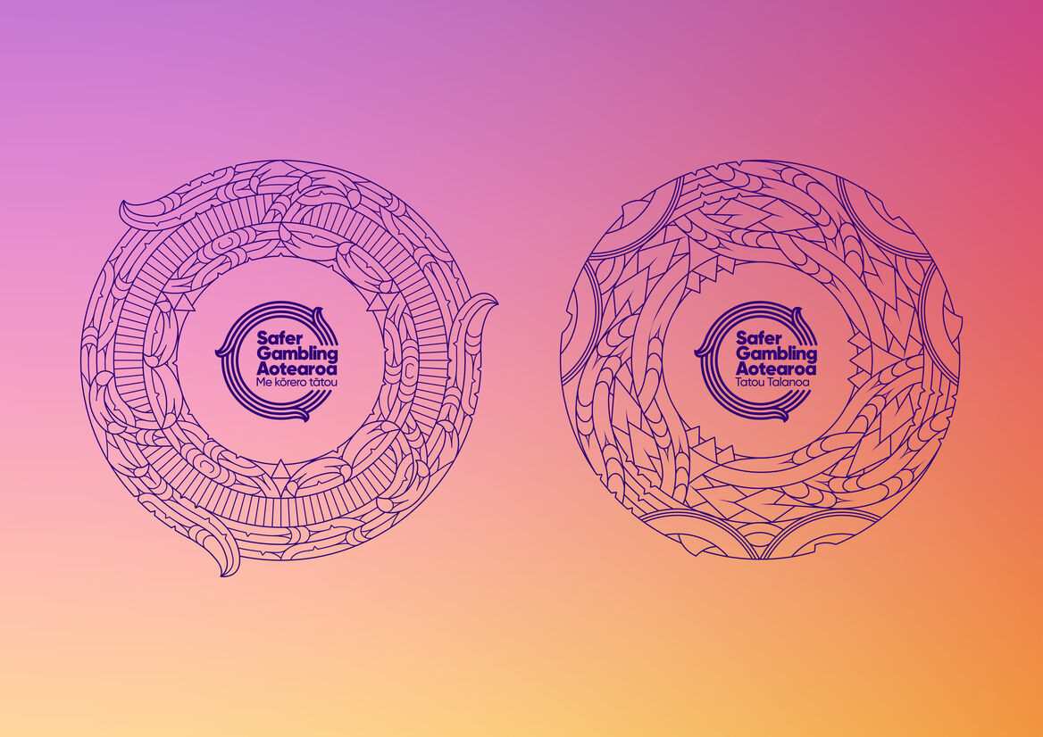 We also created two artworks (one Māori and one Pasifika), that contain culturally specific iconography, these guided the development of the logo and brand. Rather than dwelling on the sober reality of problem gambling, the Safer Gambling Aotearoa brand identity is designed to express energy and vibrancy – to lift the ‘mauri’. Other design considerations tie into the central themes; the choice of typeface mirrors the curves in the central tohu, whilst the gradients represent the diverse people of Aotearoa. The bright vibrant colour palette reflects the world of enticing lights, colour and graphics associated with gaming, but shifts the focus to a positive outcome for all.