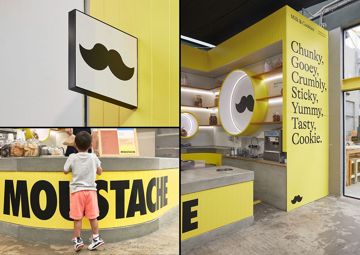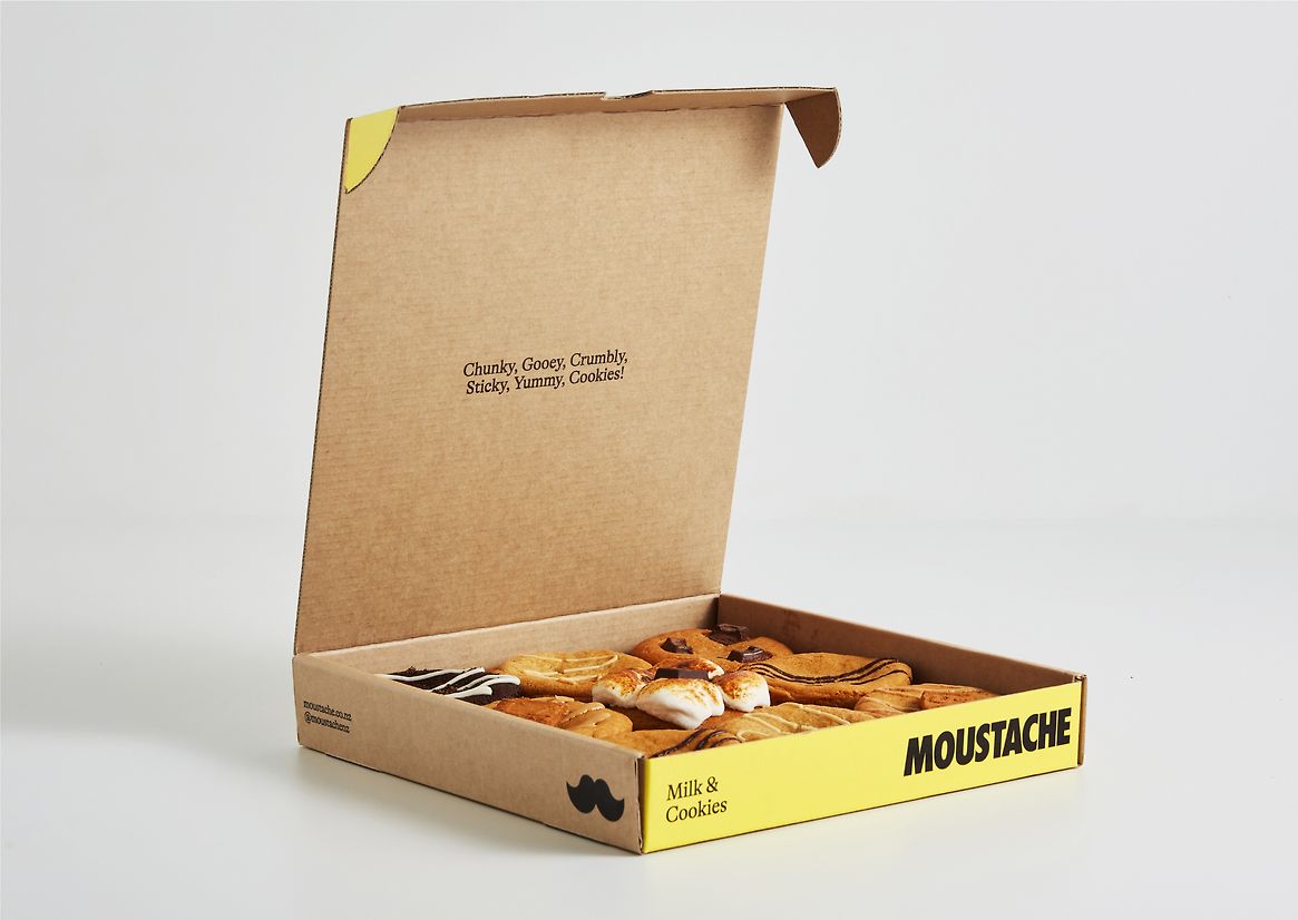 Moustache’s identity revolves around reinforced symbolism, with a stronger motif, impactful wordmark, and personified character illustrations. Playful appetite-evoking messaging celebrates the joy of eating cookies. The previous brand yellow was lightened and used generously in floods of colour throughout the identity for an instant hit of happiness. A unique and cost-effective approach to packaging reappropriates pizza boxes, contrasting the natural kraft substrate with the pop-yellow for a bold and vibrant solution. Our design was fully implemented across the brand system, including custom packaging, store design, and digital platforms. The level of craft and detail was considered to a high standard specifically through the representation and consistency of the colour yellow.