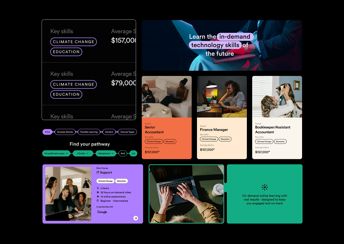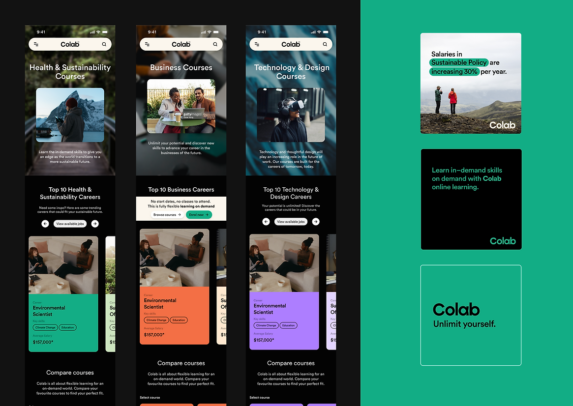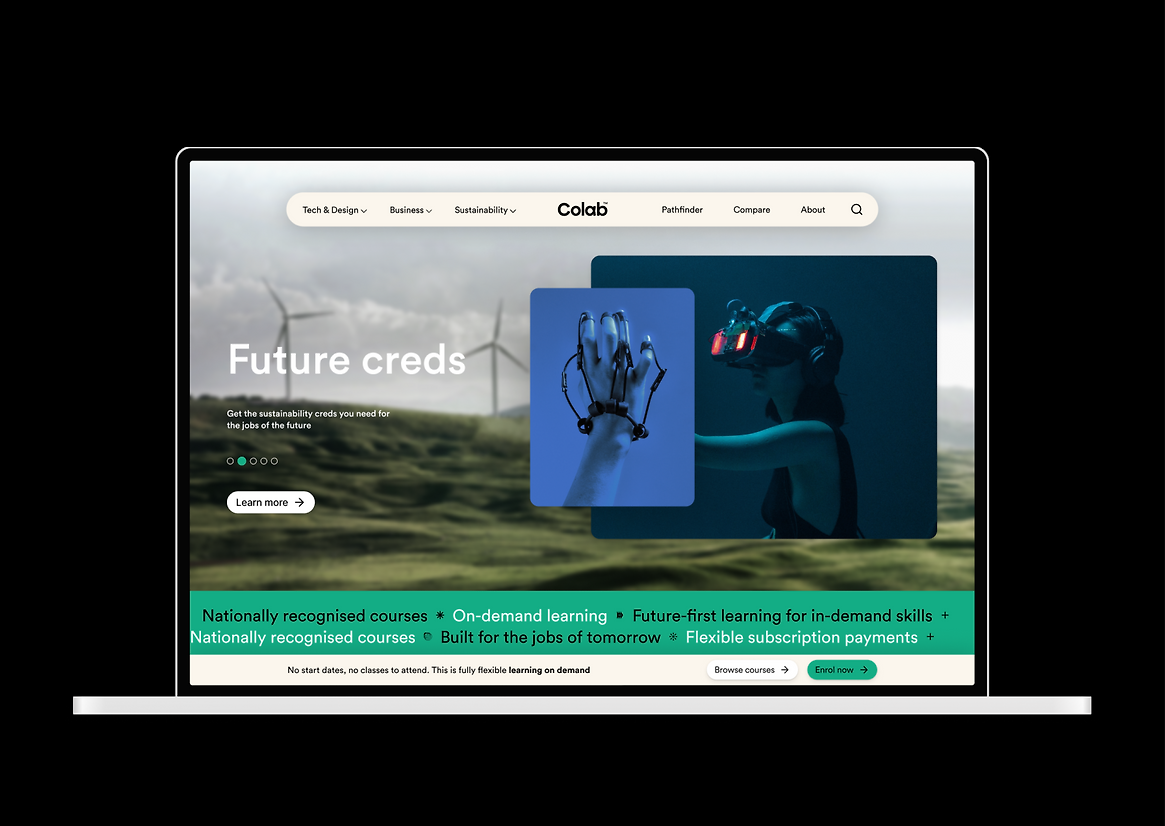 Rather than trying to fit current learning systems into an online experience, we worked with Up Education to create Colab, an online learning platform that was built web-and-mobile first. Timetables, lessons, and interactions with tutors are flexible and built around your life, not the other way around. Students could pick their own pathway, and this approach informed the entire brand identity.