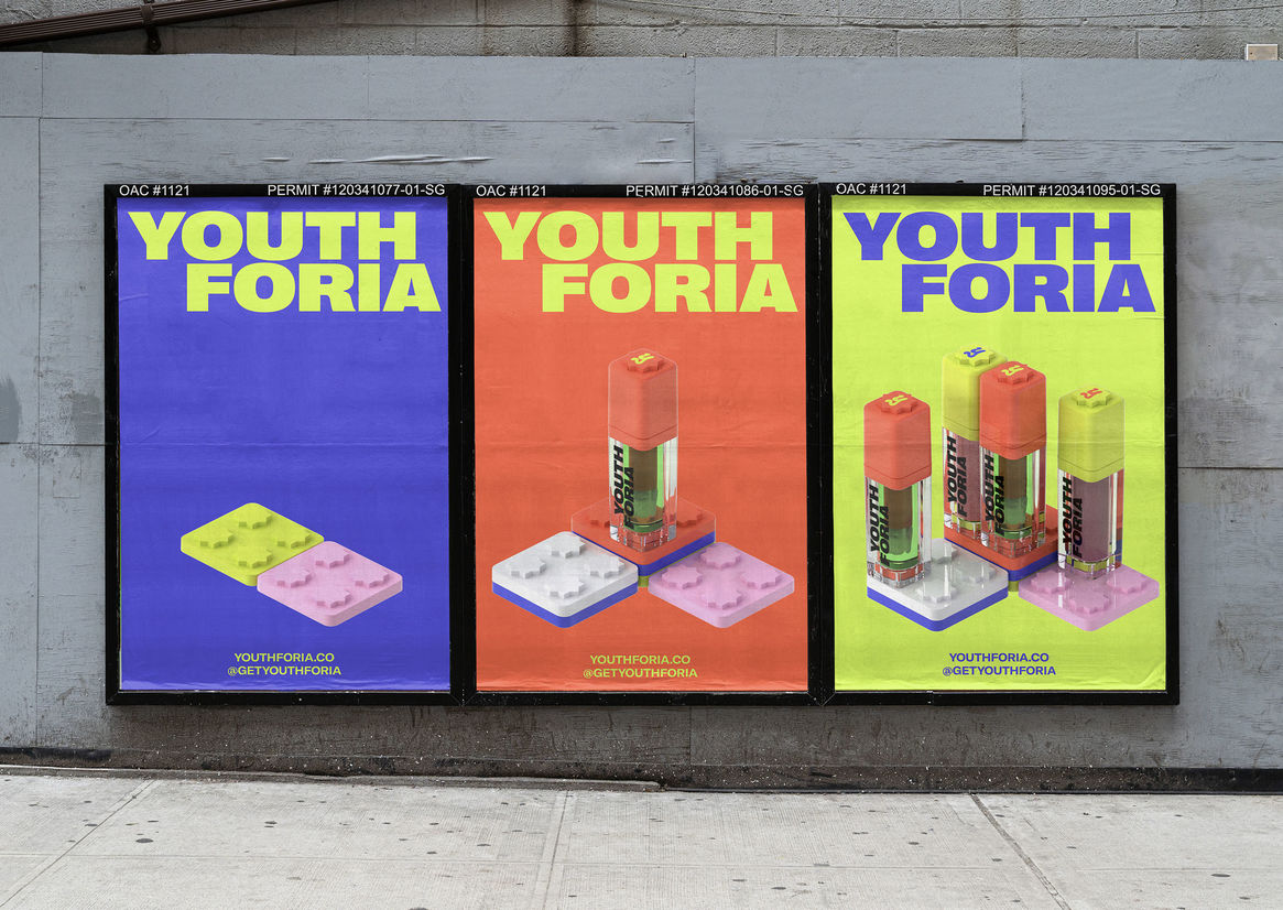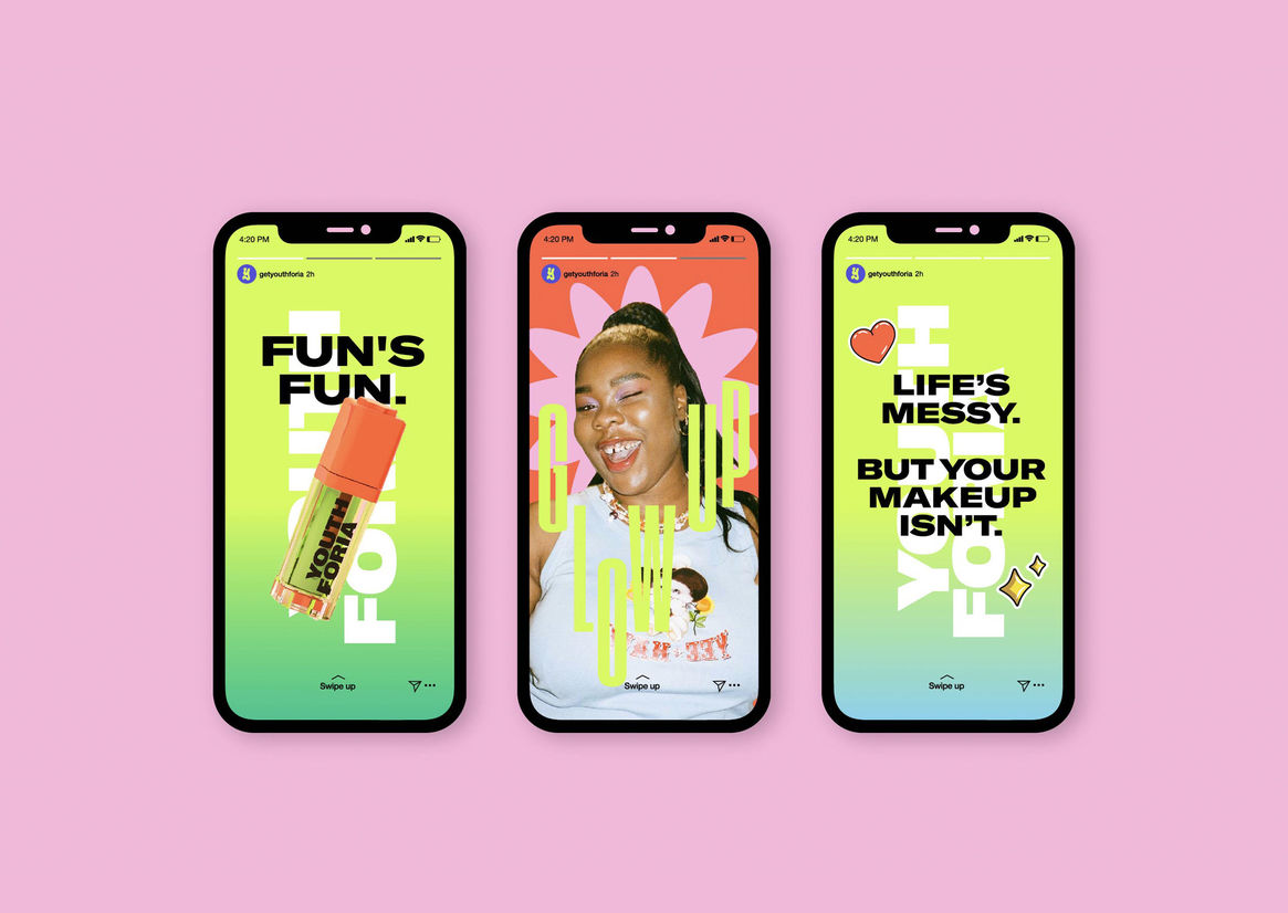 Youthforia came to us in need of a visual and verbal identity that would resonate with an always-online Gen Z audience while communicating the fun, offbeat, irreverent nature of the brand.