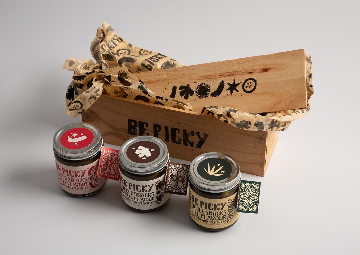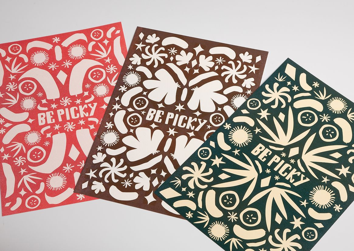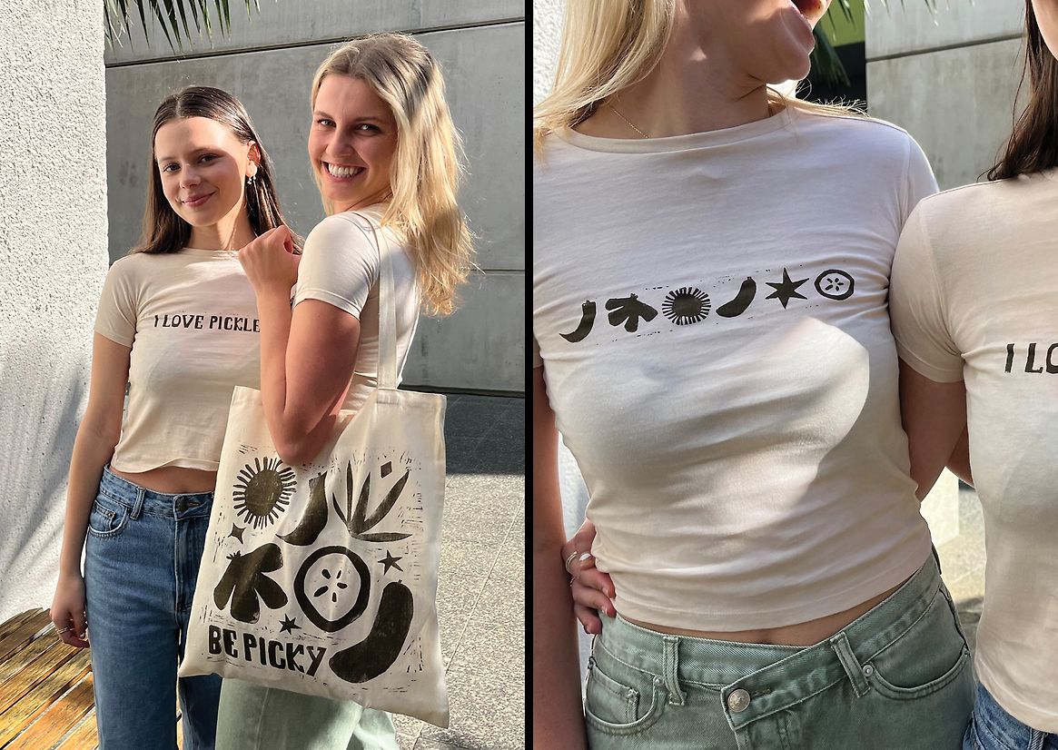 The educational attachments on the jars were handbound, while the grocery bags were crafted through linocut printing, and the baby tees were hand-dyed in coffee before also being linocut printed. These practices were emphasised in efforts to stay true to Be Picky’s core values.