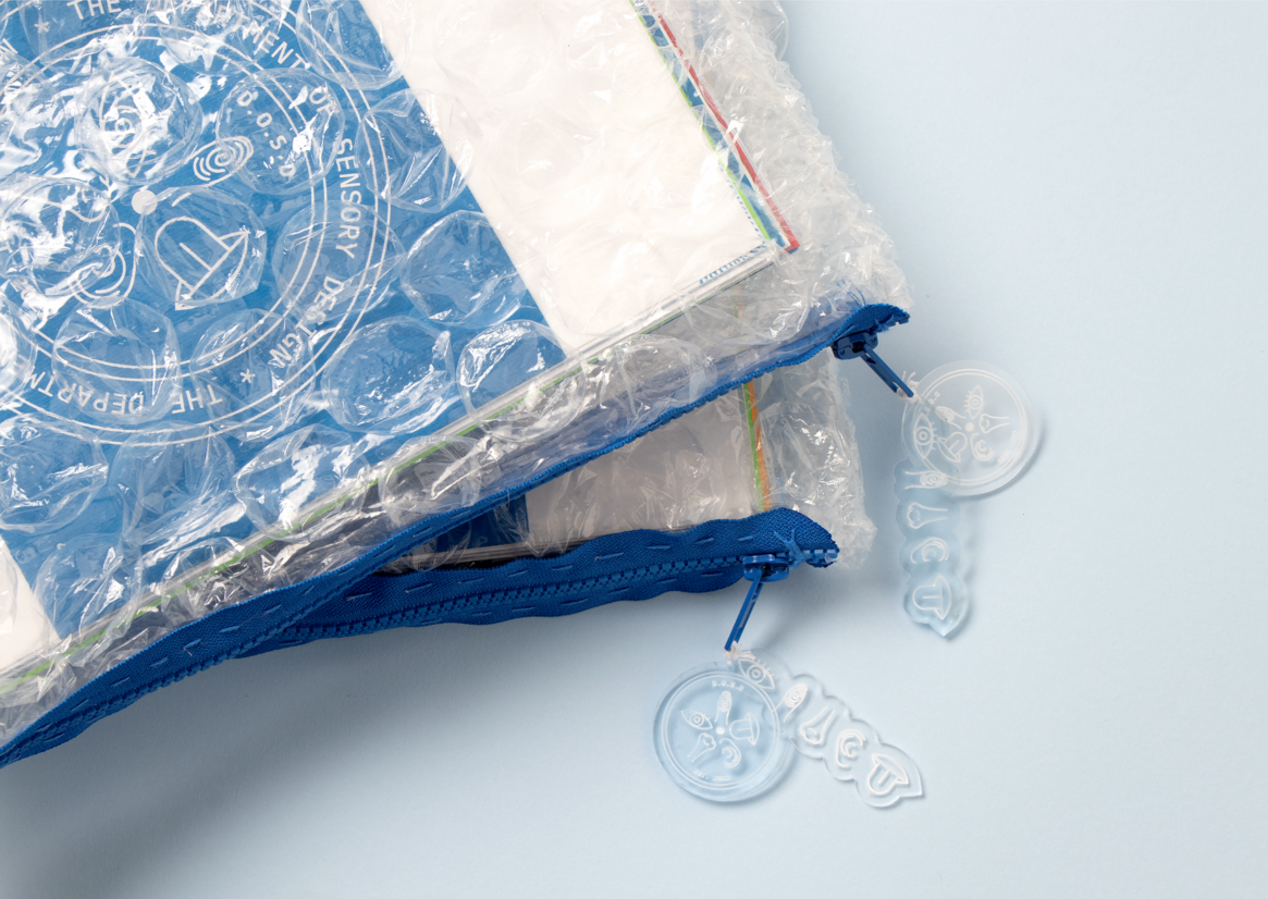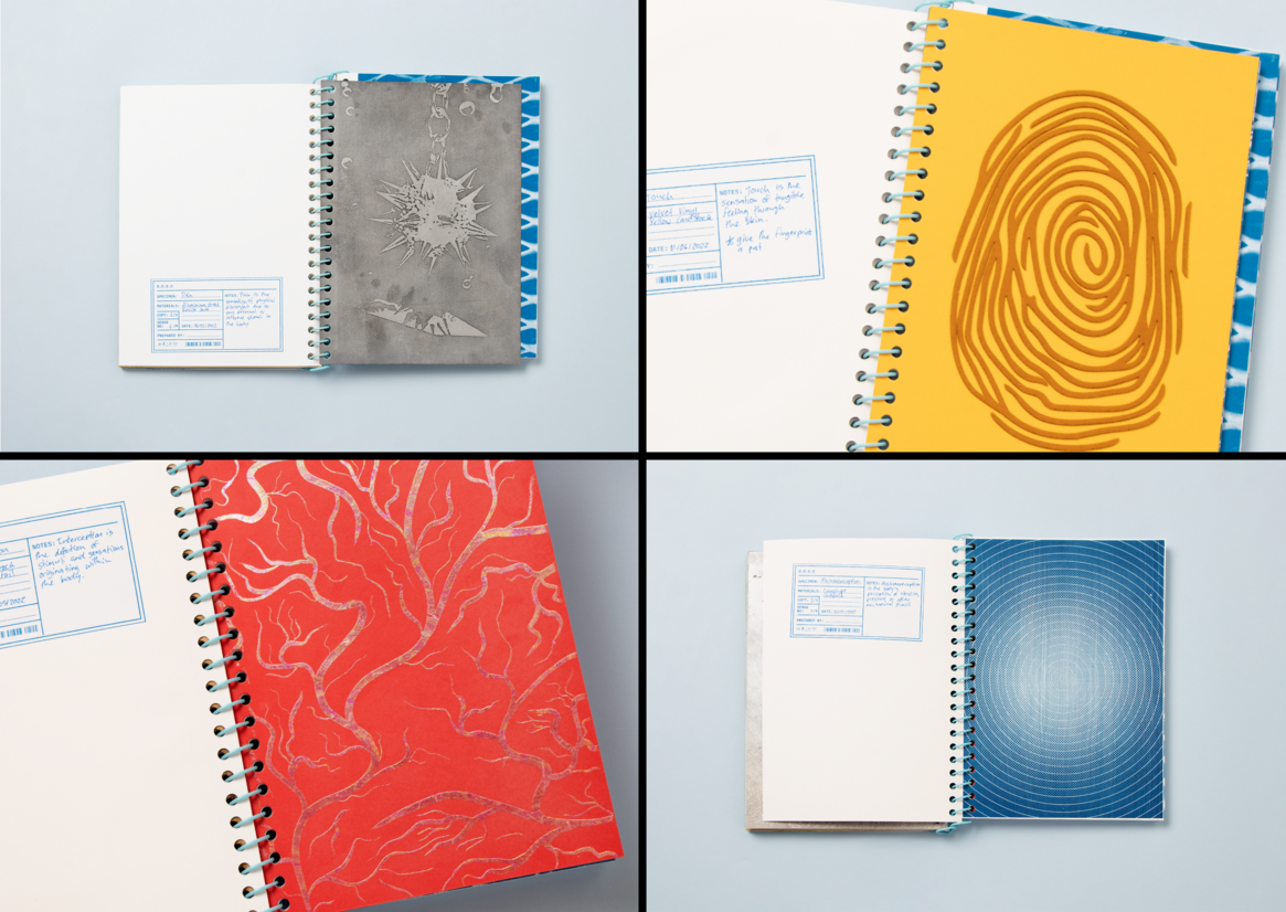 Diverse production techniques such as cyanotype, screen printing, riso printing, foiling, over-glossing, metal etching, laser cutting and laser engraving were used. Alongside paper, materials like aluminium, wood, and velvet were utilised to create a tactile experience. Scents were also employed to add another layer to the sensory experience.