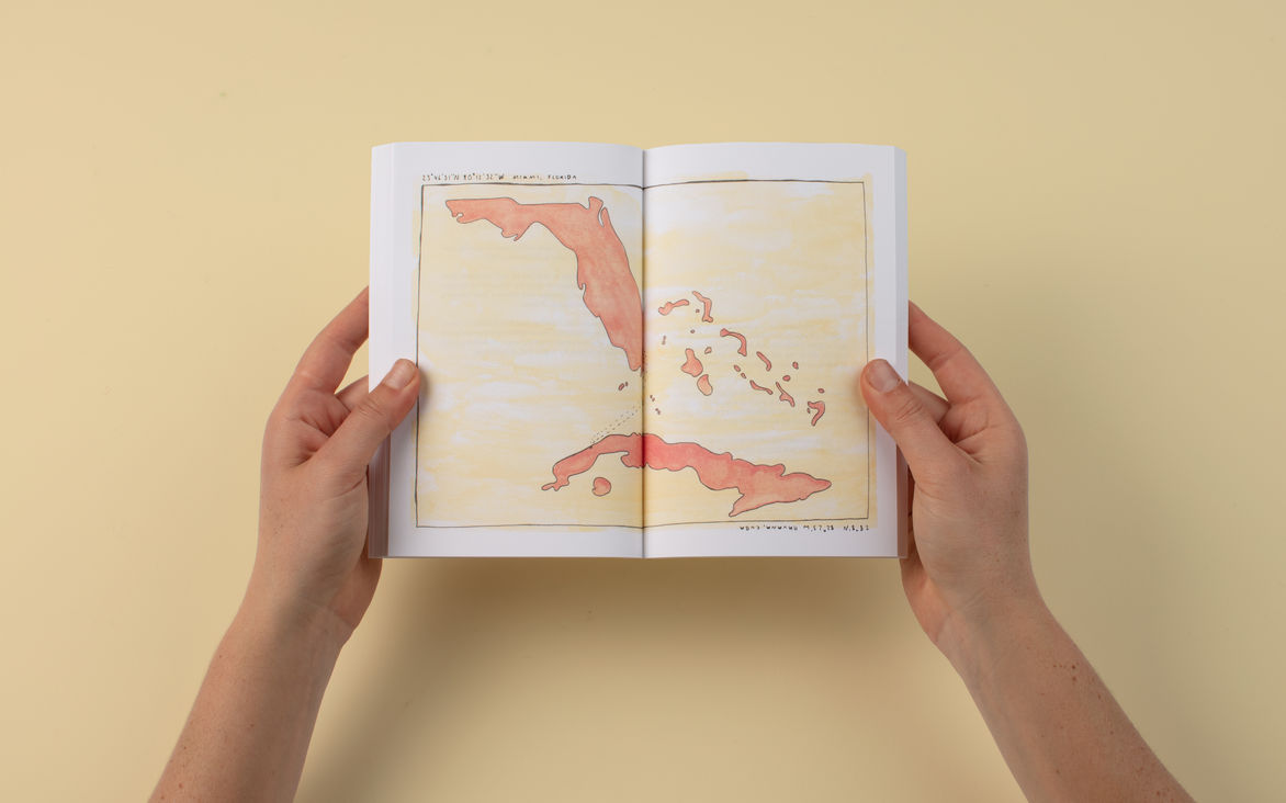 The duality of publication is visible in the two points of entry. The stories flipped upon themself and divided in the center by a map of the Cuba-Florida Strait. This physical split creates a visual metaphor of the separation of cultural and political beliefs in America and its small island neighbour. It also emphasises the close physical proximity between these two worlds. The incorporation of New Zealand newspaper articles contextualises my identity as the author and draws connections between the socio-political situations of these two colonised island nations.