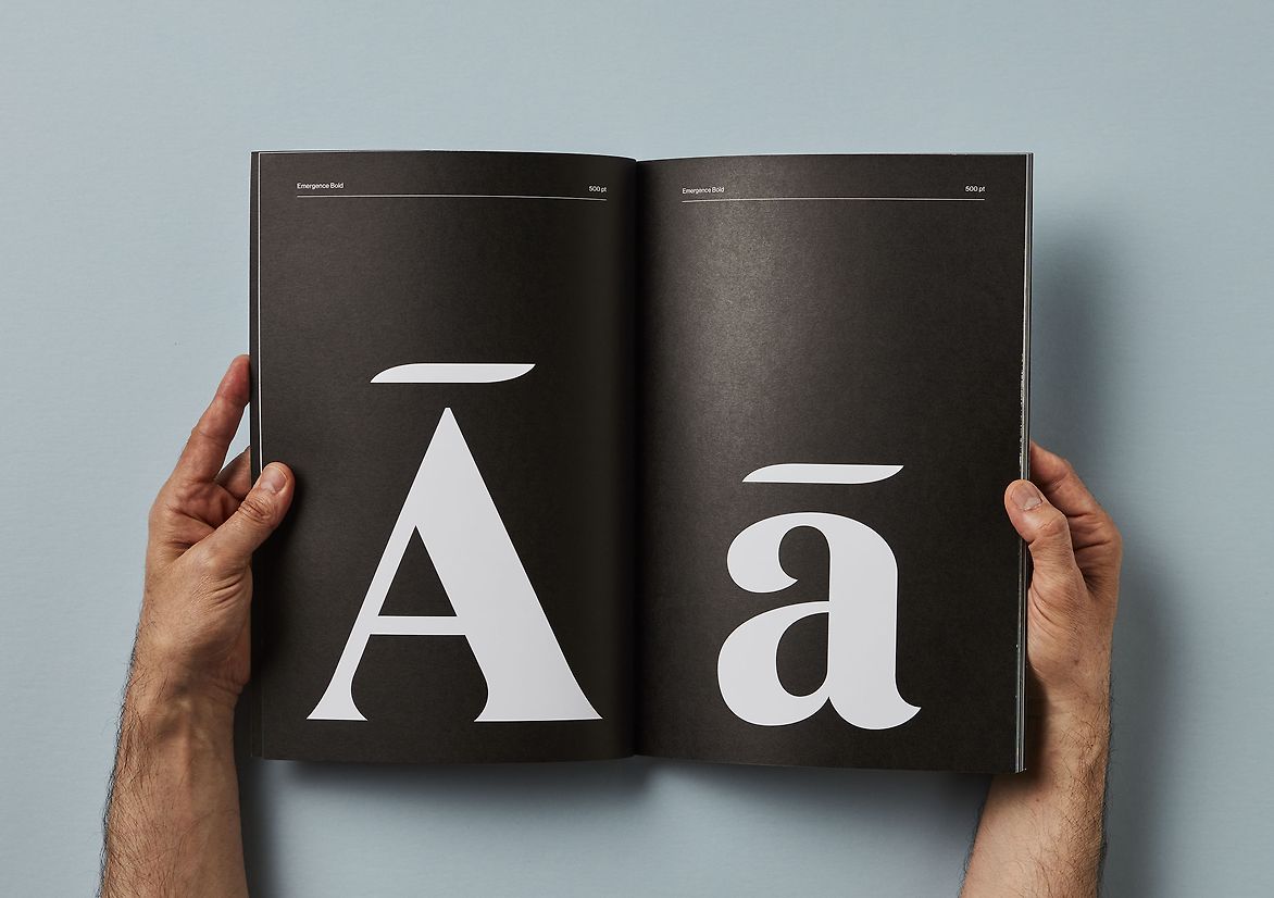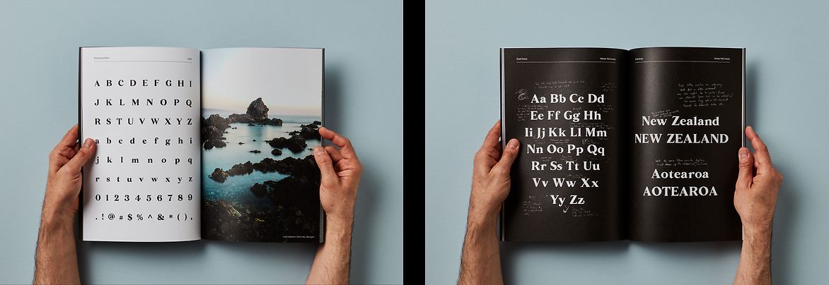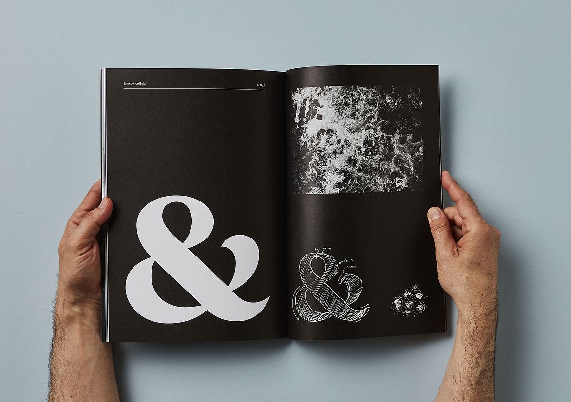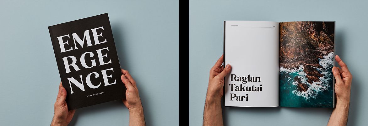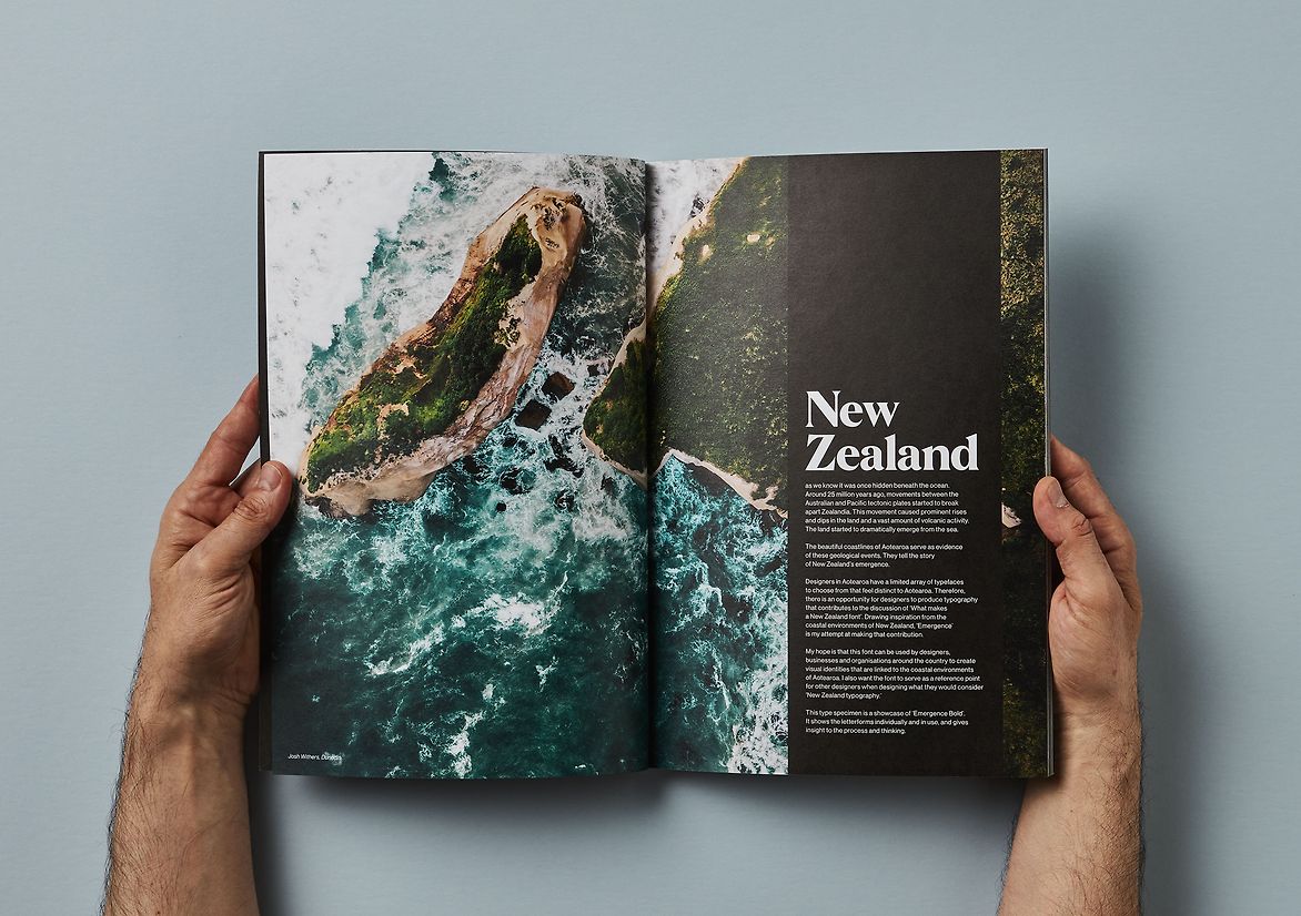 The resulting typeface, ‘Emergence Bold’, is serif display font that incorporates fluid movements, juxtaposed against sharp points and harsh angles, reminiscent of New Zealand's dramatic geography: a contrast between jagged rocks, volcanoes, and mountains and lakes, rivers, and oceans.