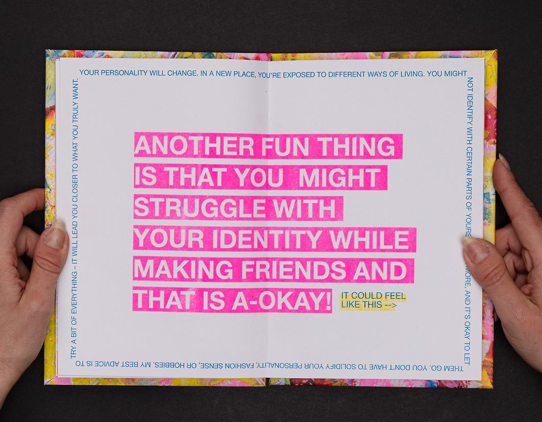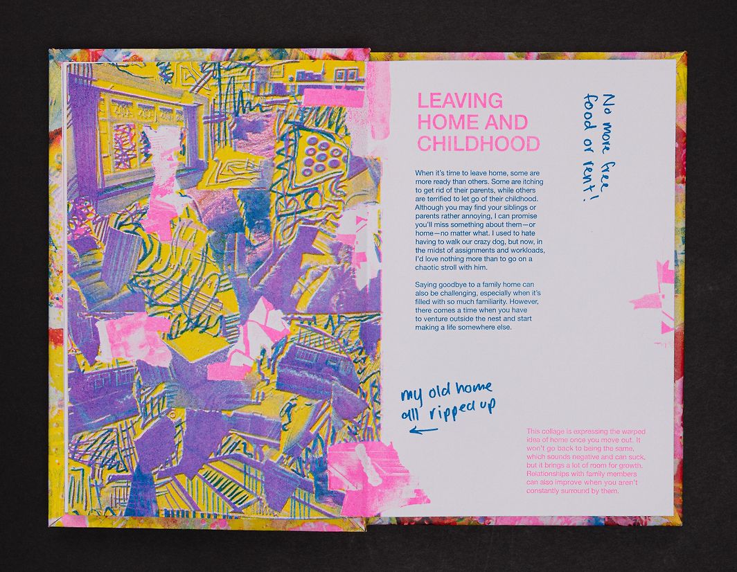 The visual strategy draws from collage as a design method. This approach mirrors the fragmented, layered emotions that accompany significant change. Paired with risograph printing—a process that embraces variation and imperfection—the work reflects the emotional texture of beginning university. Typography, layout, and annotation are all employed to simulate the erratic, energetic, and often contradictory experience of adjusting to independence, academic life, and new social environments.