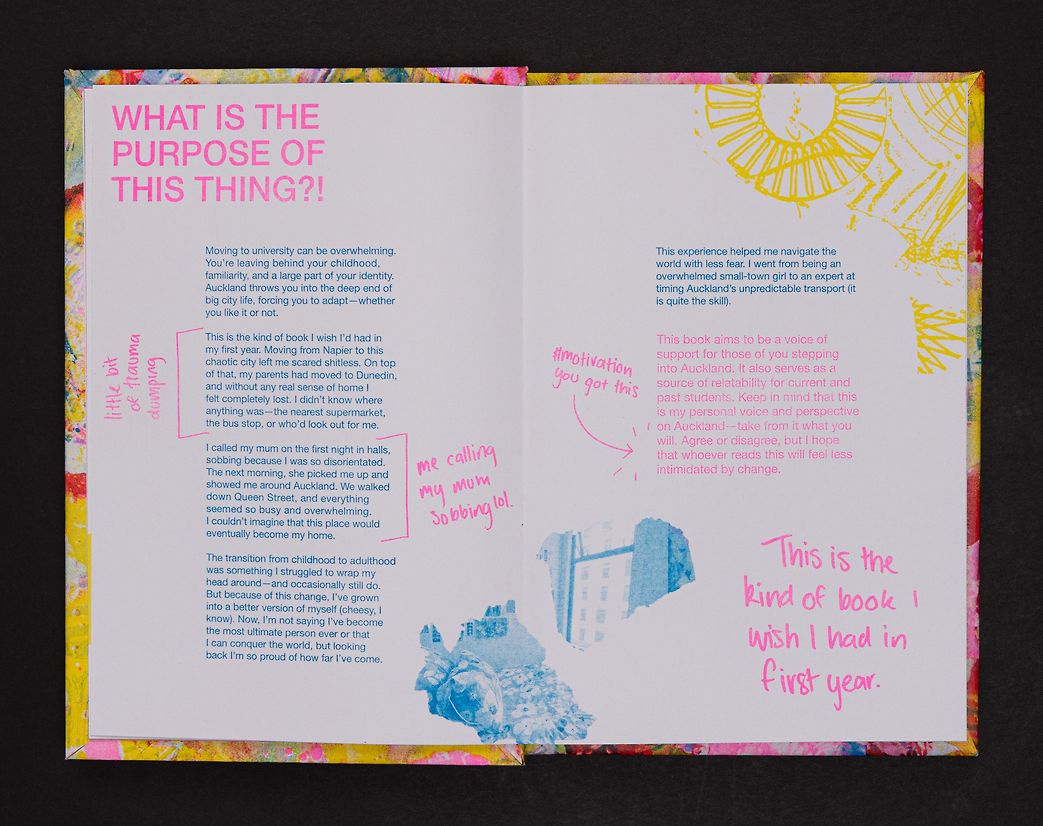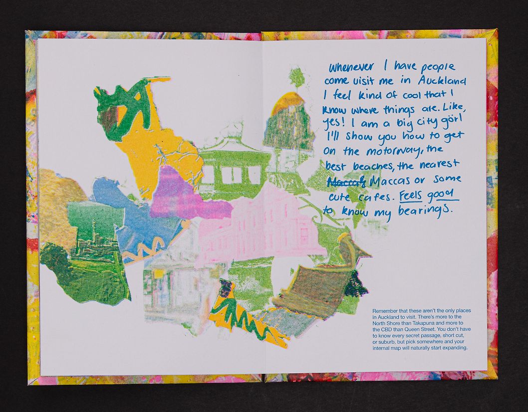 For Future Jaffas is a risograph-printed publication and concertina designed to support students transitioning into university life in Tāmaki Makaurau Auckland. As Aotearoa New Zealand’s largest city, Auckland can feel overwhelming and isolating—particularly for students arriving from smaller towns or different cultural contexts. This project responds to that emotional and social dislocation by offering a tangible, peer-informed guide created by someone who has navigated the same path. The publication shares lived reflections and insights through collage, unfiltered layouts, and informal, colloquial writing. It avoids prescriptive advice in favour of presenting honest experiences—from homesickness and identity, to social rituals and navigating the city’s idiosyncrasies. By doing so, it positions the student as the expert rather than the institution, offering a sense of solidarity and recognition at a pivotal life stage. What distinguishes For Future Jaffas is its departure from digital-first resources. While universities tend to rely on websites and social media for student orientation, this project offers something physical—something to hold, annotate, and revisit. Research indicates that printed materials promote stronger emotional engagement and long-term recall compared to digital formats (Jones, 2014; Jarrett, 2022). Designed with Gen Z students in mind, the publication and its concertina counterpart resist the ephemerality of digital media by encouraging slower, more reflective engagement.
