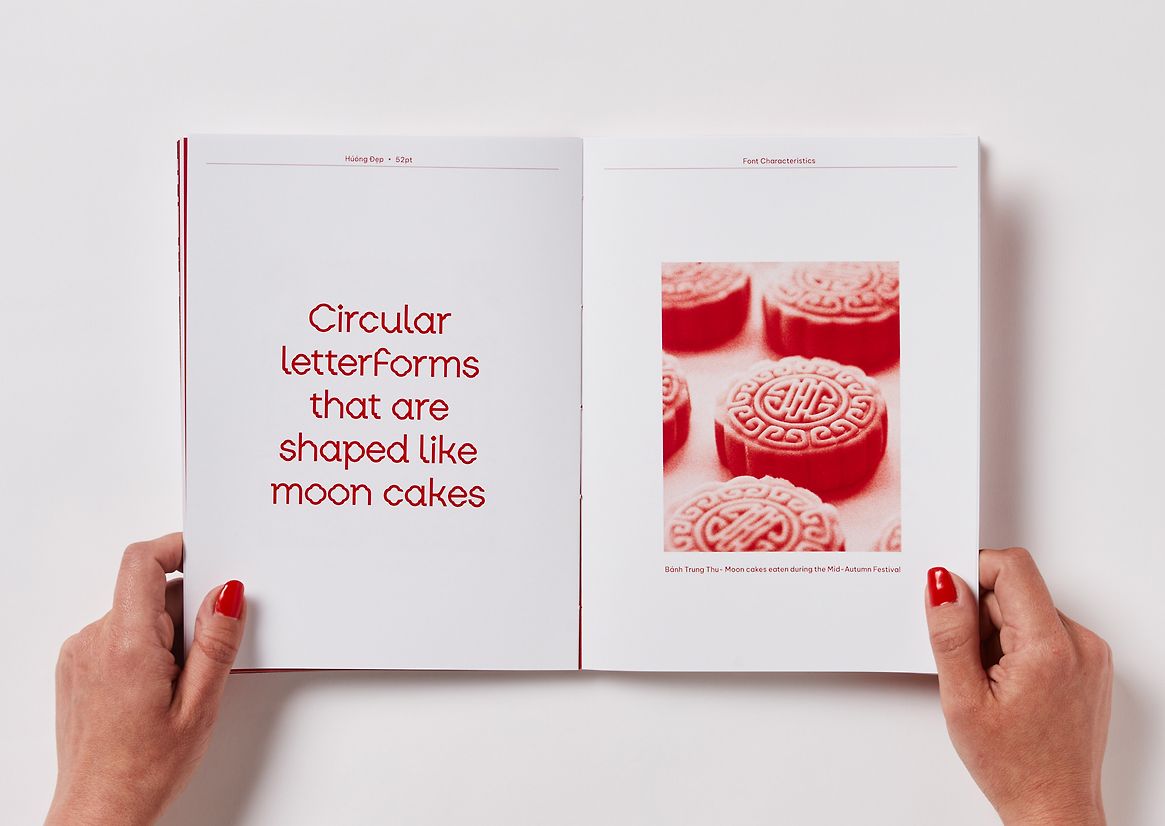 The festive Vietnamese theme continues into the physical application of the type specimen,reinforcing the inspiration and core of Hương Display. Furthermore, the specimen is encased in an illustrated poster jacket sleeve referencing the traditional folk painting which catalysed the visual characteristics of the typeface. Through the publication, the project is displayed from idea and process to the meticulous details of each diacritic. Following the pages of this specimen aims to evoke a response from the audience whether they have little connection to Vietnam or none. Hương display intends to start conversation, reflection and connection. Sharing the Vietnamese language through the design of Hương Display typeface fosters cross-cultural connections and adds value to the diversity of design in Aotearoa.