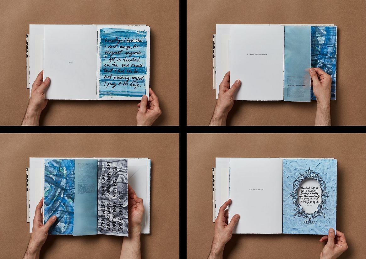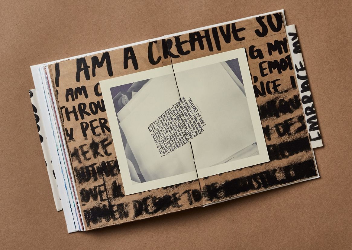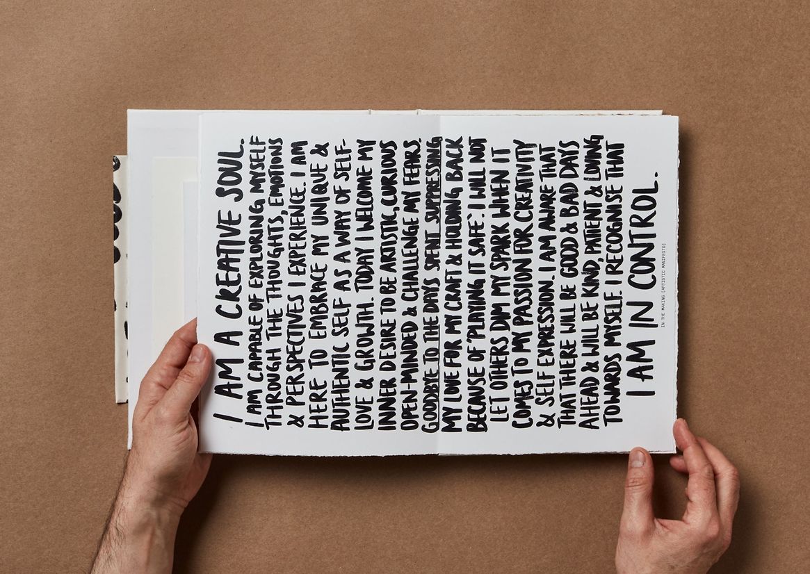 The book showcases intricate details of handmade craftsmanship in the construction. Using French link and Coptic stitch binding in an exposed spine adds to the project's overall message of the significance of using our hands to create and show admiration for handmade artefacts. Each page is hand-ripped leaving a raw edge that metaphors the confronting and vulnerable topics within the book. The spreads contain intricately hand-crafted image-made backgrounds that were digitally scanned and integrated. Analogue methodologies and mixed-media materials were essential to demonstrate the project's creative expression. The book dust cover can be unfolded into an A2 poster, revealing a handwritten manifesto that embodies the overall project. The bold lettering and message are written as a statement of intent to inspire and give purpose to the viewer.