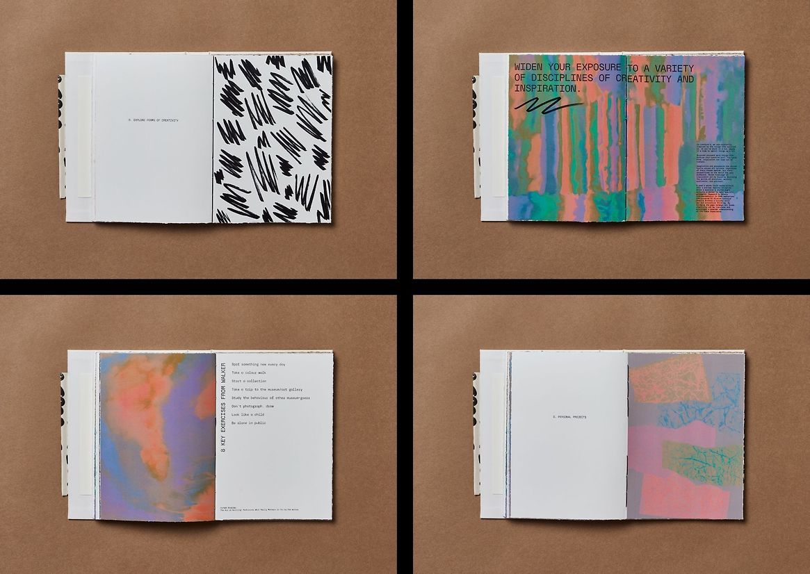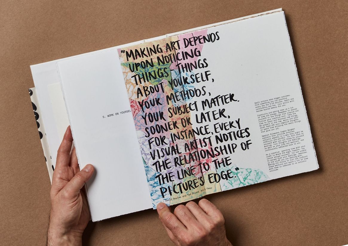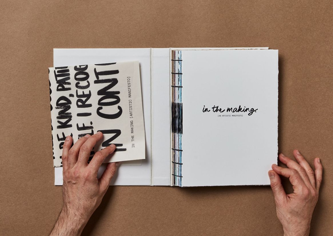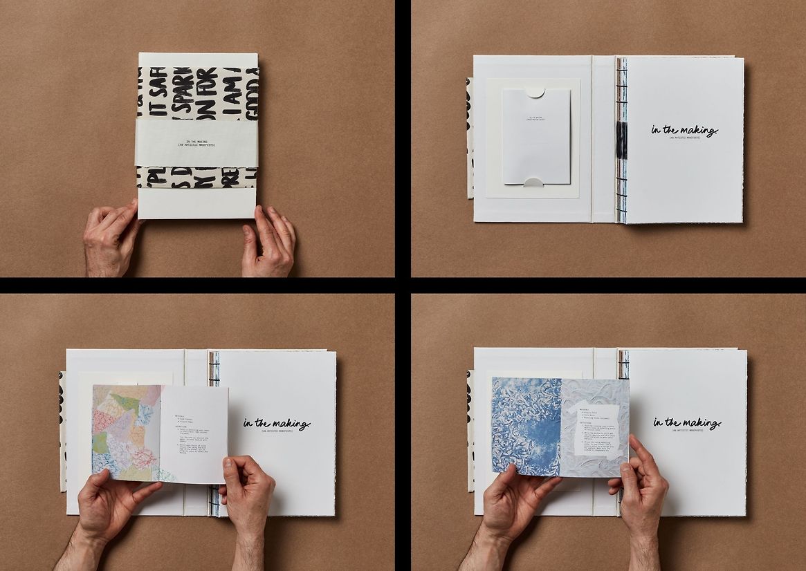 The book showcases intricate details of handmade craftsmanship in the construction. Using French link and Coptic stitch binding in an exposed spine adds to the project's overall message of the significance of using our hands to create and show admiration for handmade artefacts. Each page is hand-ripped leaving a raw edge that metaphors the confronting and vulnerable topics within the book. The spreads contain intricately hand-crafted image-made backgrounds that were digitally scanned and integrated. Analogue methodologies and mixed-media materials were essential to demonstrate the project's creative expression. The book dust cover can be unfolded into an A2 poster, revealing a handwritten manifesto that embodies the overall project. The bold lettering and message are written as a statement of intent to inspire and give purpose to the viewer.