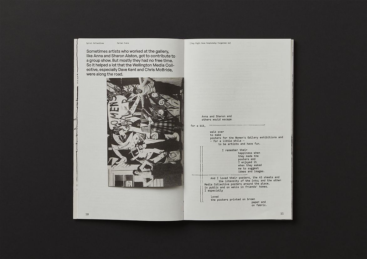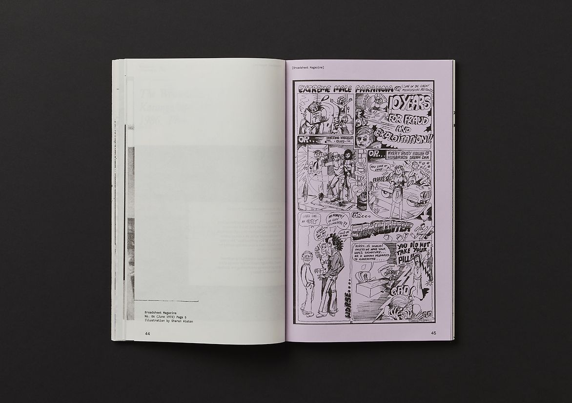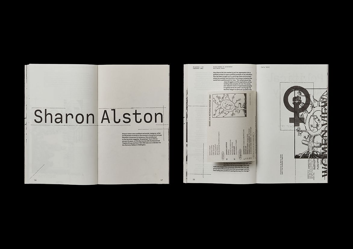 Sharon Alston was a multifaceted artist and activist who played a vital role in the women's movement and gay liberation in Aotearoa. Sadly, the work of Alston and so many other women involved in these movements is not recognised and correctly attributed. Taking its name from the feminist initiative Broadsheet Magazine column ‘Kicking Against the Pricks’ to which she contributed to, this project is a celebration of Alston’s valuable contribution to the important movements that have shaped Aotearoa. Alongside her work, the publication includes stories and fond memories from other women’s rights activists who knew and respected her. This project took an experimental approach to the design, following a historiographical approach, archive collecting, and experimentation to visually reflect the mahi Alston produced. The result is a handprinted and handbound publication that includes a collected bibliography of Alston's work. It serves as a valuable resource for anyone interested in learning about Sharon Alston and the critical role she played in the women's movement and gay liberation in Aotearoa. The publication utilises various paper stocks to create clear visual and textural as well as textual separation between sections. The hardcover of this book employs relief printing with transparent ink on recycled board, achieving a subtle deboss effect that balances legibility and texture.