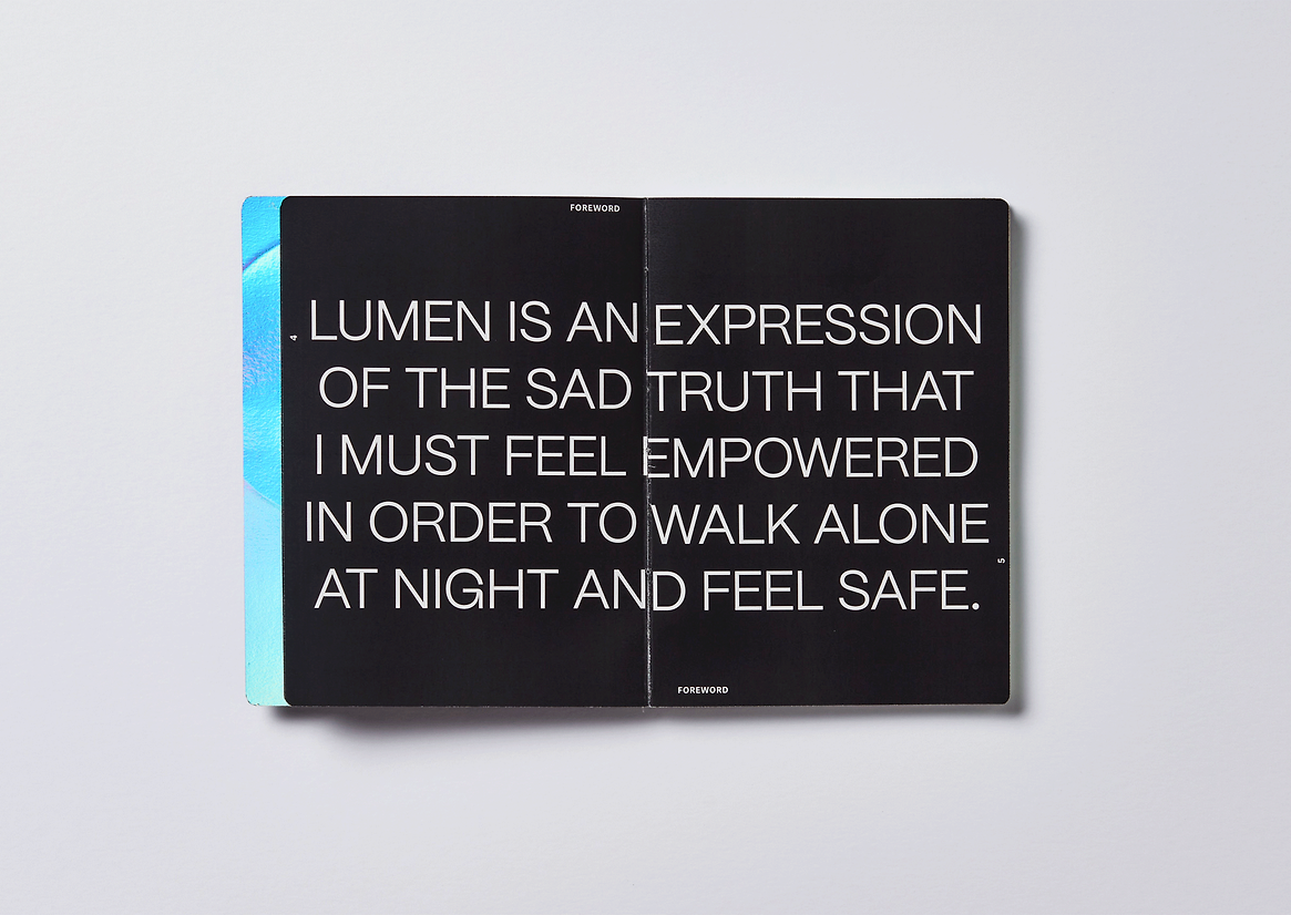 Lumen is the expression of the sad truth that I must feel empowered to walk home at night and feel safe. This project explores where that empowerment lies, whether it is under the warm glow of the streetlamps or the knowledge that I am not alone in this feeling of darkness. I often wonder what it would be like to walk home after a night out or an evening at work without fear or uneasiness. The emotions attached to these feelings inspired an artistic journey through the relationship between light and dark in the city.
