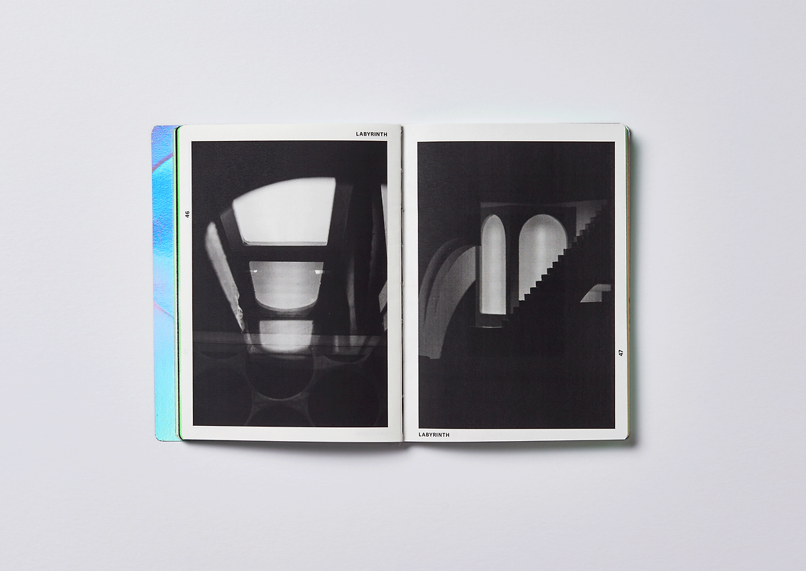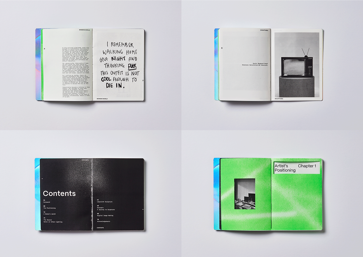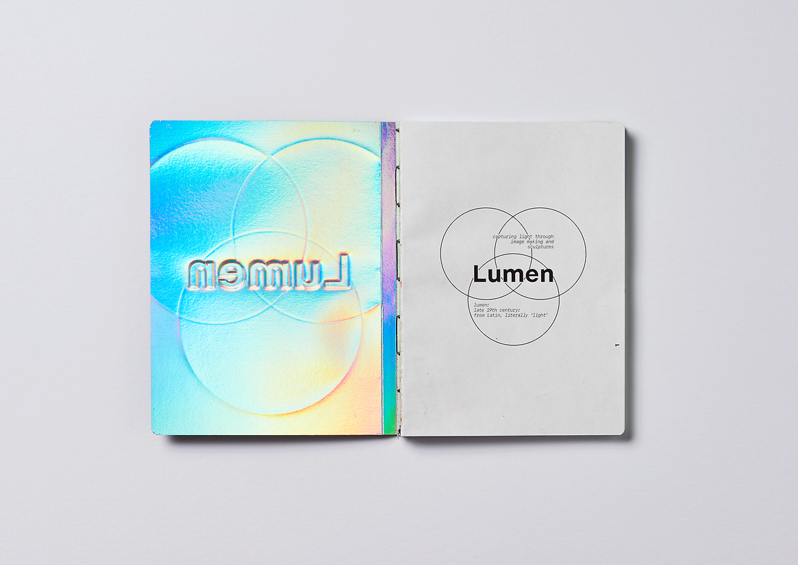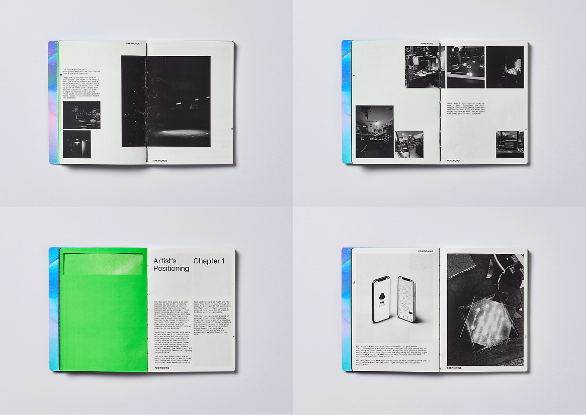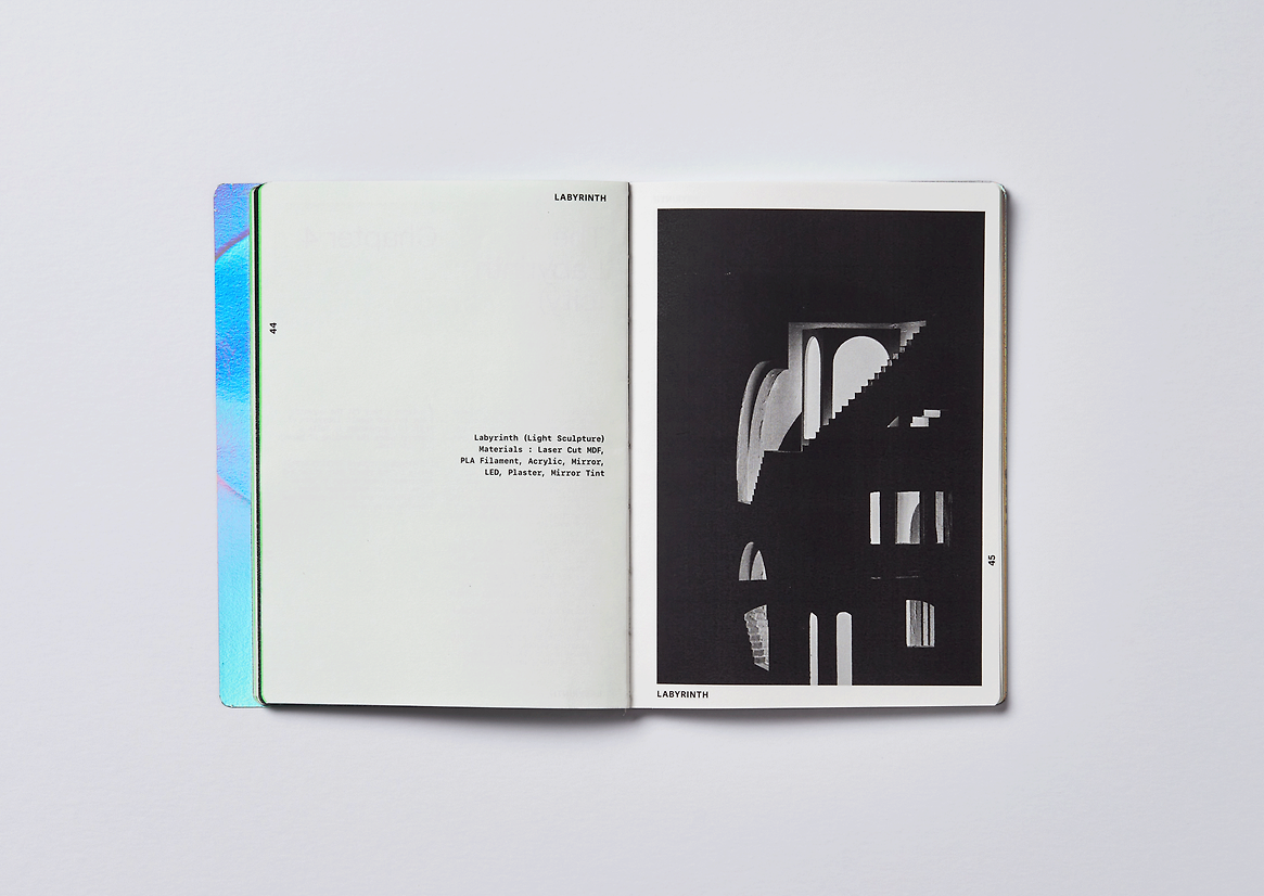 The design artefacts of Lumen are a handbound publication of the Artist’s findings and the Lighting Sculpture “Labyrinth”. The publication is an exploration between the relationship of light and dark in Auckland Central. Throughout this project the reader is taken through the journey of Photographic, Illustrative, Sculptural and Rendered pieces that relate to Light and Dark on a personal and societal level. The core thematic of Dark/Light is reflected visually with Black and White Print with Metallic and Neon Dividers throughout the work. Content such as journal scans and drawings were a product of a heuristic investigation, and type and binding techniques a product of my research into Editorial Artists Journals.