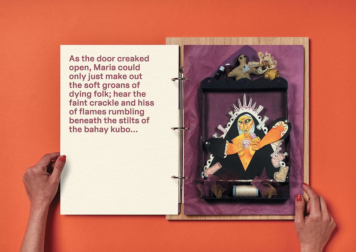 Maria, Maria! is a project that seeks to explore the many facets of Filipina Identity in the realm of visual and literary representation. To do this, it follows the story and adventures of a fictional character named Maria. Part Pre-Colonial myth, part homage to the 19th Century Spanish-Colonial Filipina, Maria grapples with struggles of identity, religion, appearance, and courage—all themes that modern day, real-world Filipinas struggle with. Thus, the project hopes that young Filipinas—who rarely get to see themselves and the complexities of their cultural identity properly represented in the media—may read Maria’s story and see themselves reflected in her heroic, yet vulnerable acts. Through a series of seven assemblages, Maria traverses through sea, land, and sky, bringing the bold landscapes and bright, colourful creatures of Filipino mythology into the intensely sacred space of devotional shrines and 3D assemblages. By framing indigenous folklore with Western Literary Devices, the project hopes to create a timeless, familiar narrative that all audiences can enjoy—with a native twist.