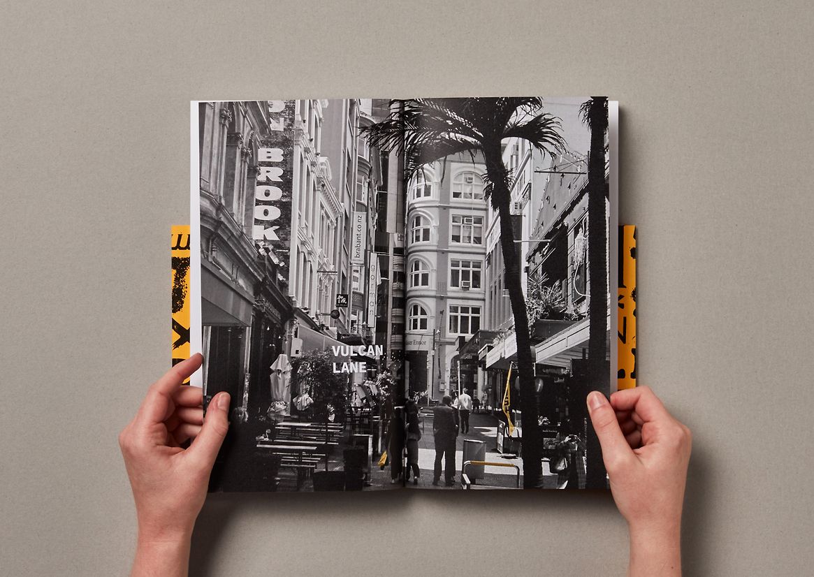 Aspects such as the colour scheme were designed to mimic the area. The colour most representative of the area is the yellow of the road markings so this was used as a visual device in the spreads, cover and stitching of the book. The yellow stripe laminated into the sides of the cover was designed to mimic the yellow lines found on the streets.