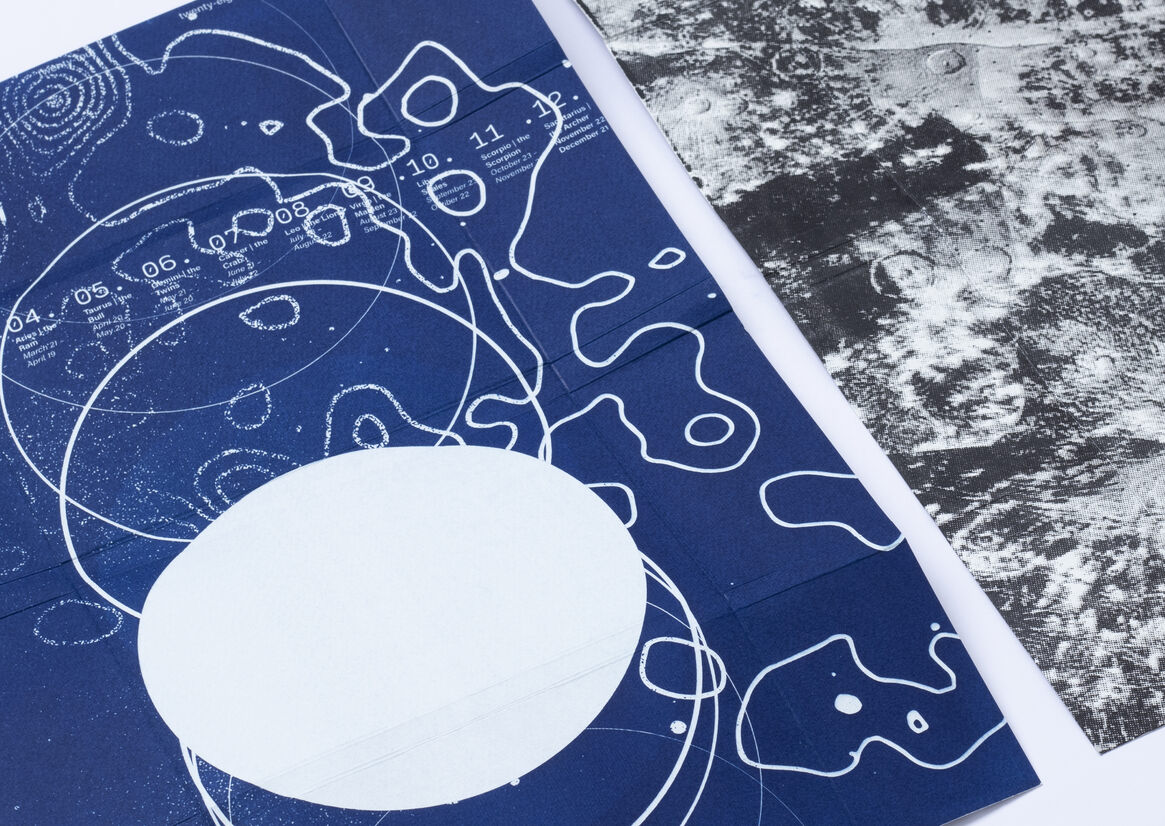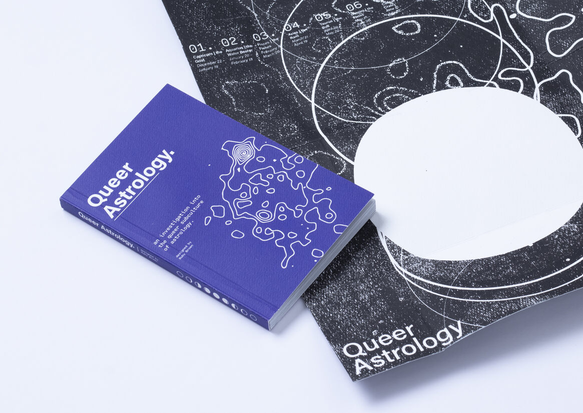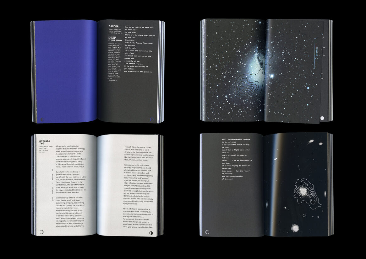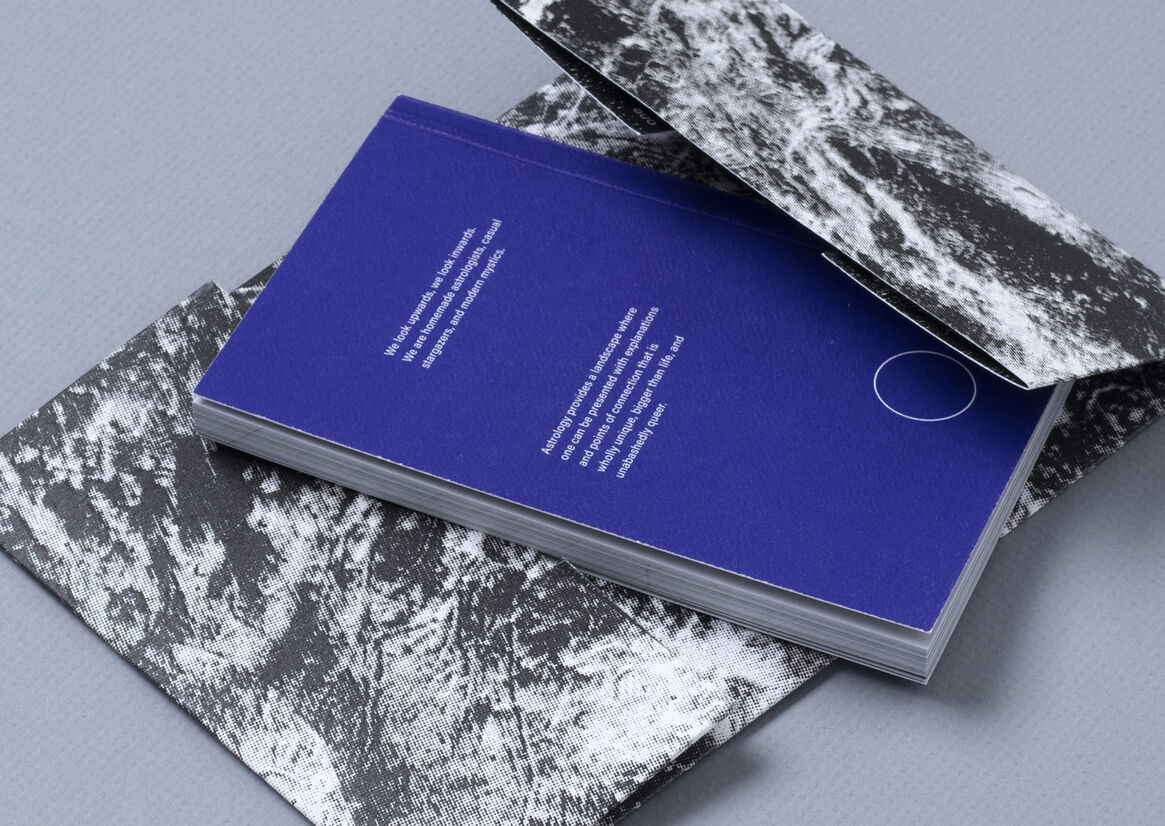 In an attempt to understand this: the book is collated and designed as a handbook with articles and self-reflections from queer authors and astrology aficionados, to build a guide to the subculture of queer astrology. The book is meant to be used, lent to friends, or even turned into an emergency coffee coaster! It is intended to be warm, nostalgic, a part of the jumble in your tote bag. The double-sided foldable jacket doubles as a poster, one side with a cyanotype print, the other with a duo-tone metallic screen print.