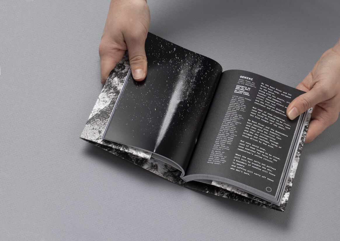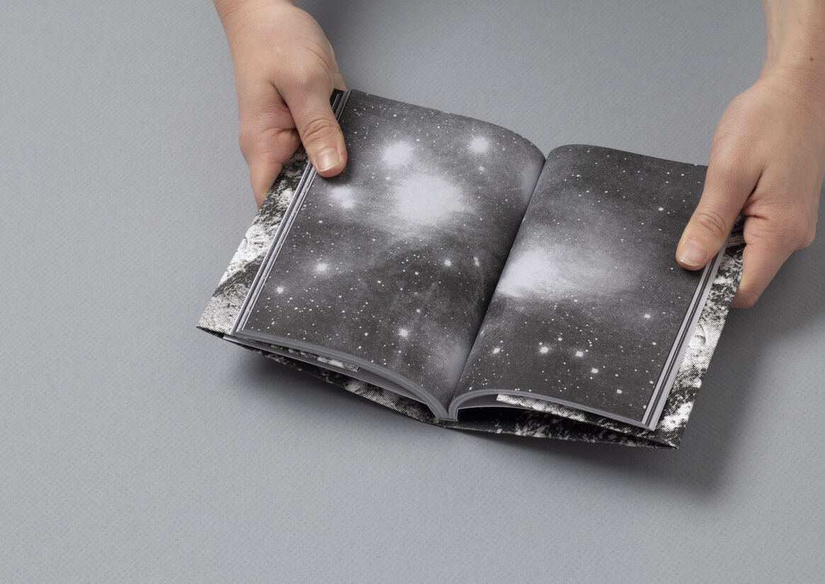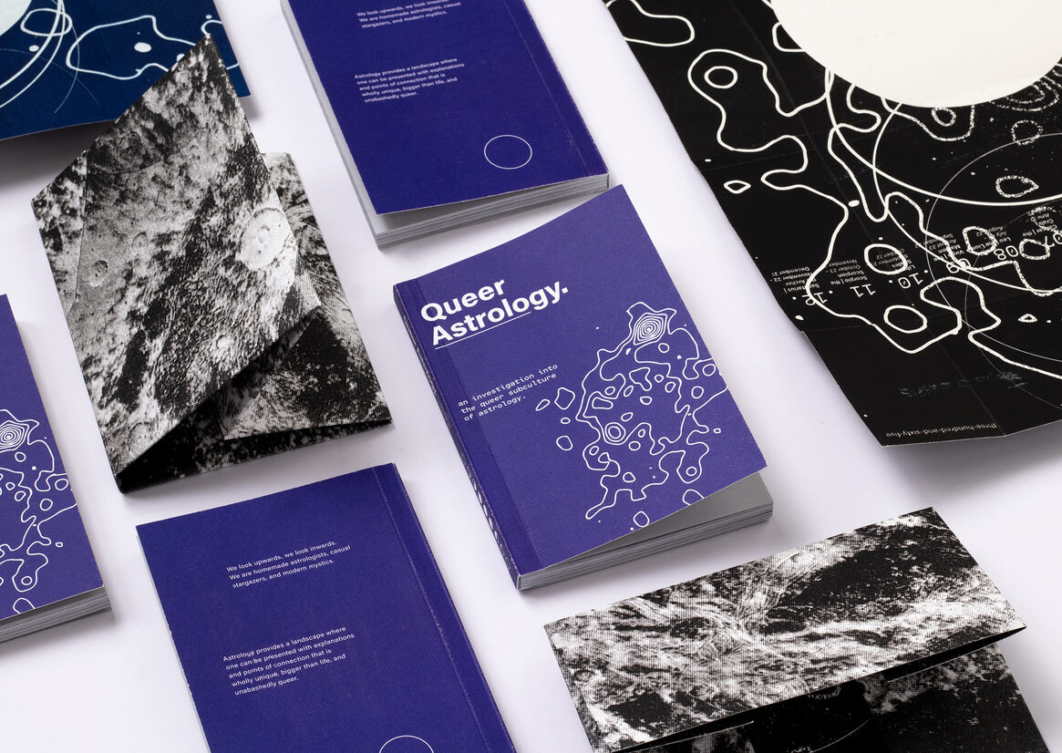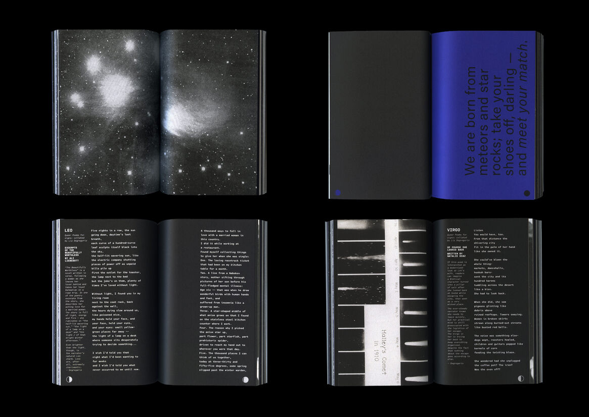 In an attempt to understand this: the book is collated and designed as a handbook with articles and self-reflections from queer authors and astrology aficionados, to build a guide to the subculture of queer astrology. The book is meant to be used, lent to friends, or even turned into an emergency coffee coaster! It is intended to be warm, nostalgic, a part of the jumble in your tote bag. The double-sided foldable jacket doubles as a poster, one side with a cyanotype print, the other with a duo-tone metallic screen print.