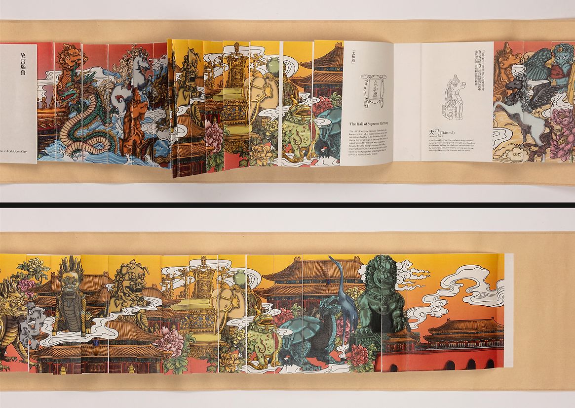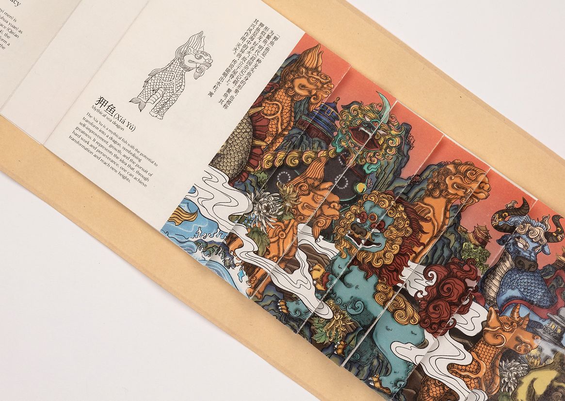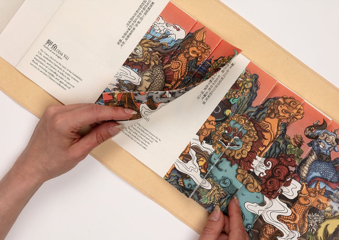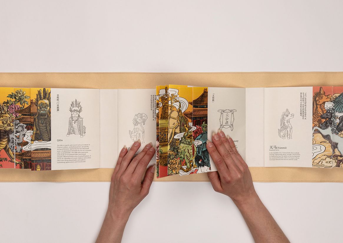This project reimagines the mythical creatures of the Forbidden City through a contemporary design lens. It features a fold book created using Dragon Scale Binding, that combines traditional fine-line ink illustration with bright, modern gradients inspired by imperial Chinese colour schemes. The artefact includes laser-cut bamboo packaging referencing palace window motifs, allowing the viewer to glimpse the scroll as if peering into myth. Gold foiling, calligraphy, and handcrafted details elevate the experience. Designed to reconnect younger audiences with Chinese mythology, the project blends historical symbolism with interactive storytelling to preserve culture in a fresh, modern form.