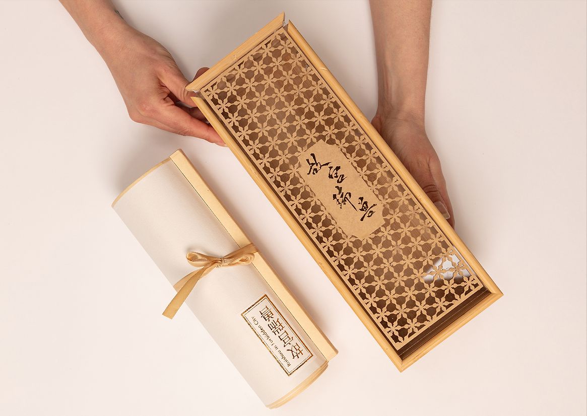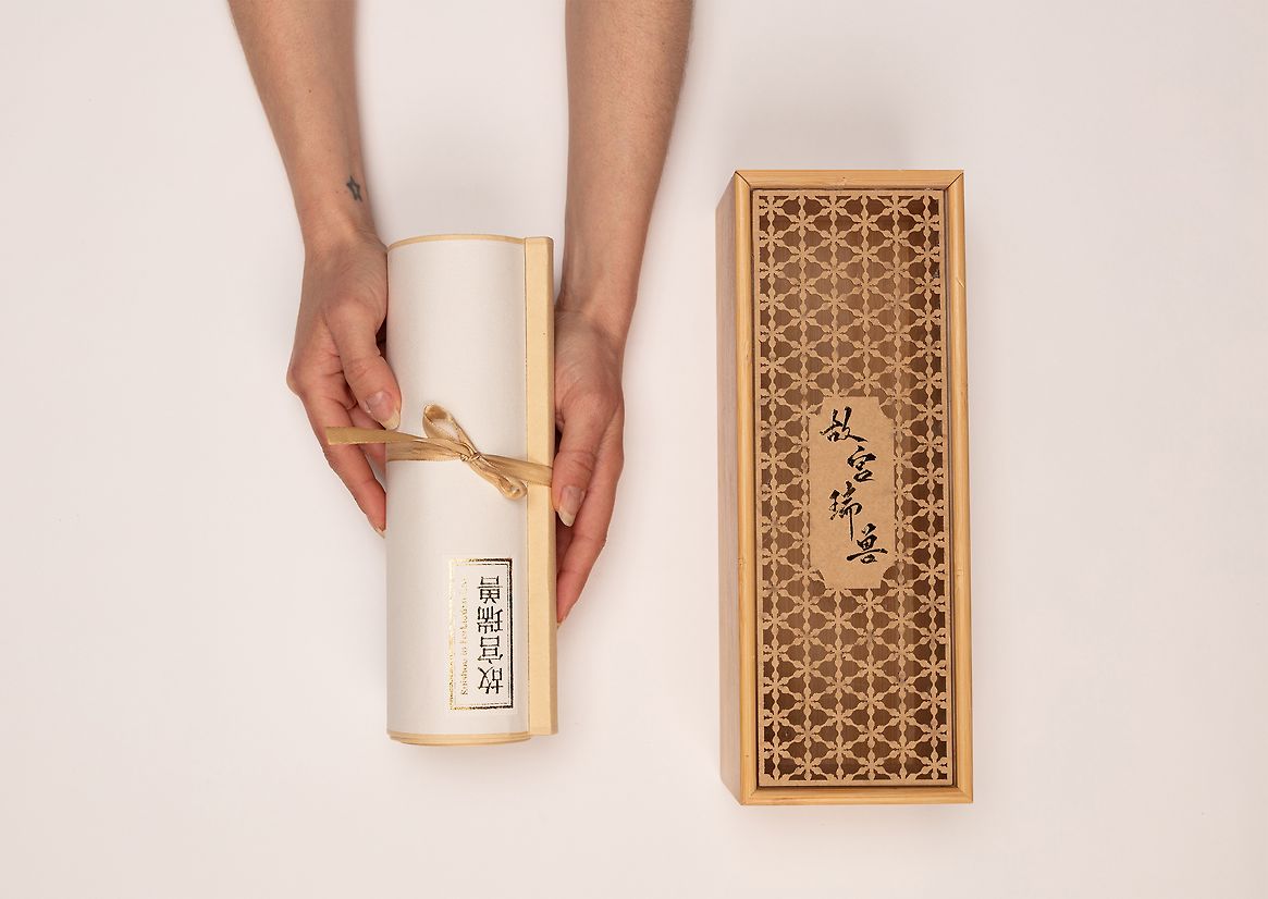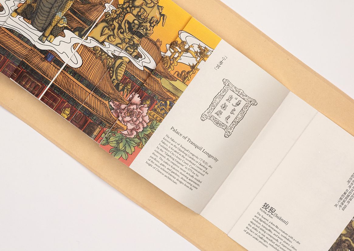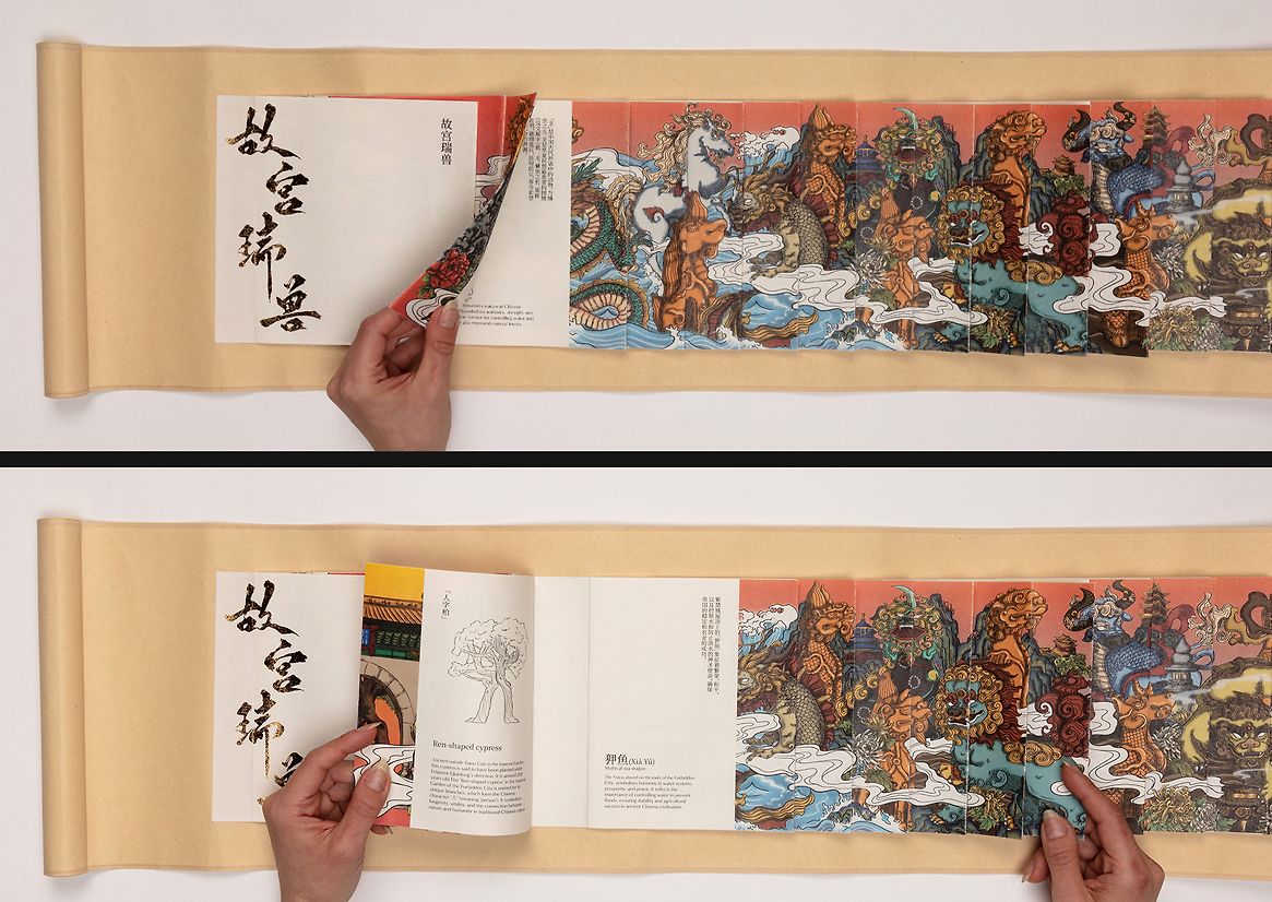 This project reimagines the mythical creatures of the Forbidden City through a contemporary design lens. It features a fold book created using Dragon Scale Binding, that combines traditional fine-line ink illustration with bright, modern gradients inspired by imperial Chinese colour schemes. The artefact includes laser-cut bamboo packaging referencing palace window motifs, allowing the viewer to glimpse the scroll as if peering into myth. Gold foiling, calligraphy, and handcrafted details elevate the experience. Designed to reconnect younger audiences with Chinese mythology, the project blends historical symbolism with interactive storytelling to preserve culture in a fresh, modern form.