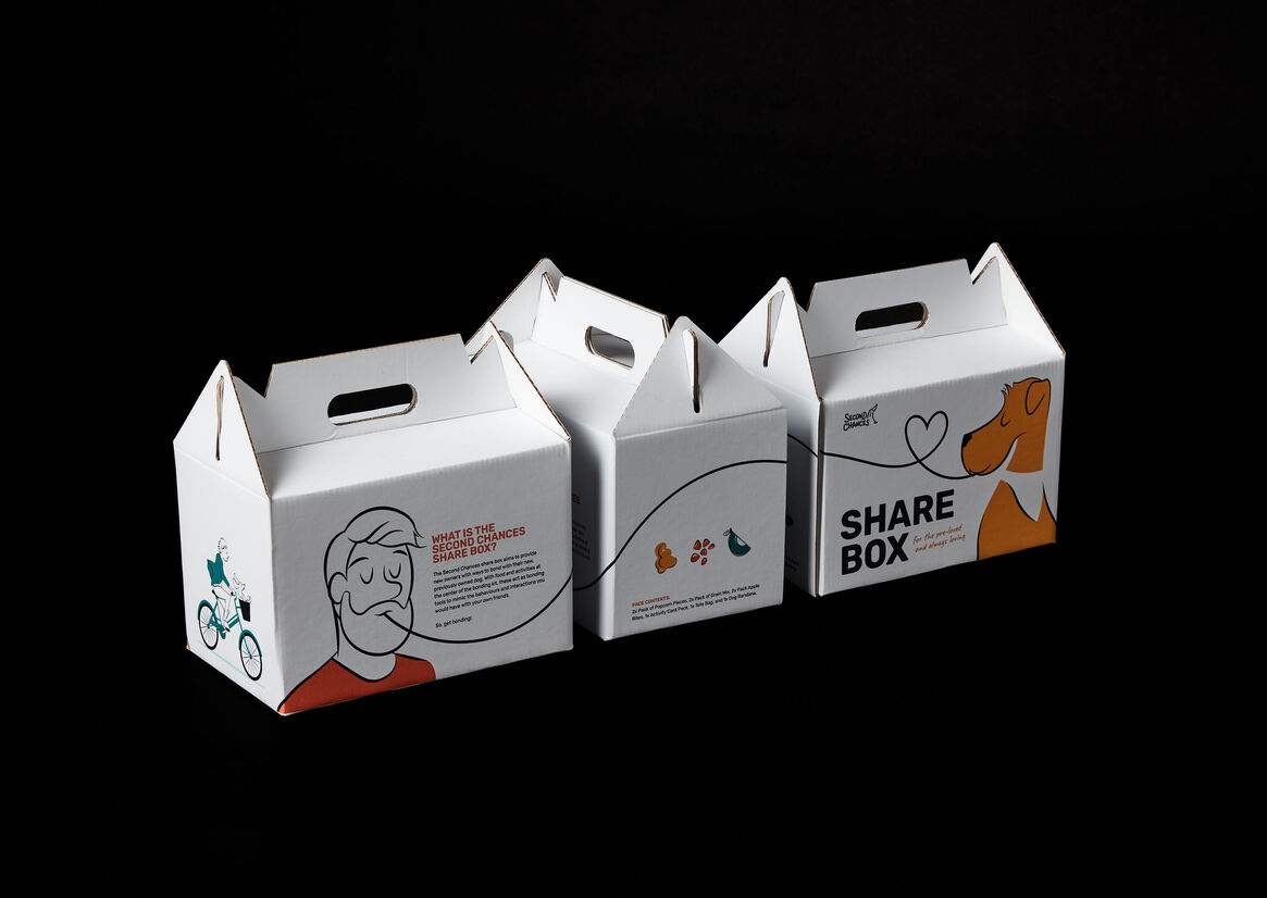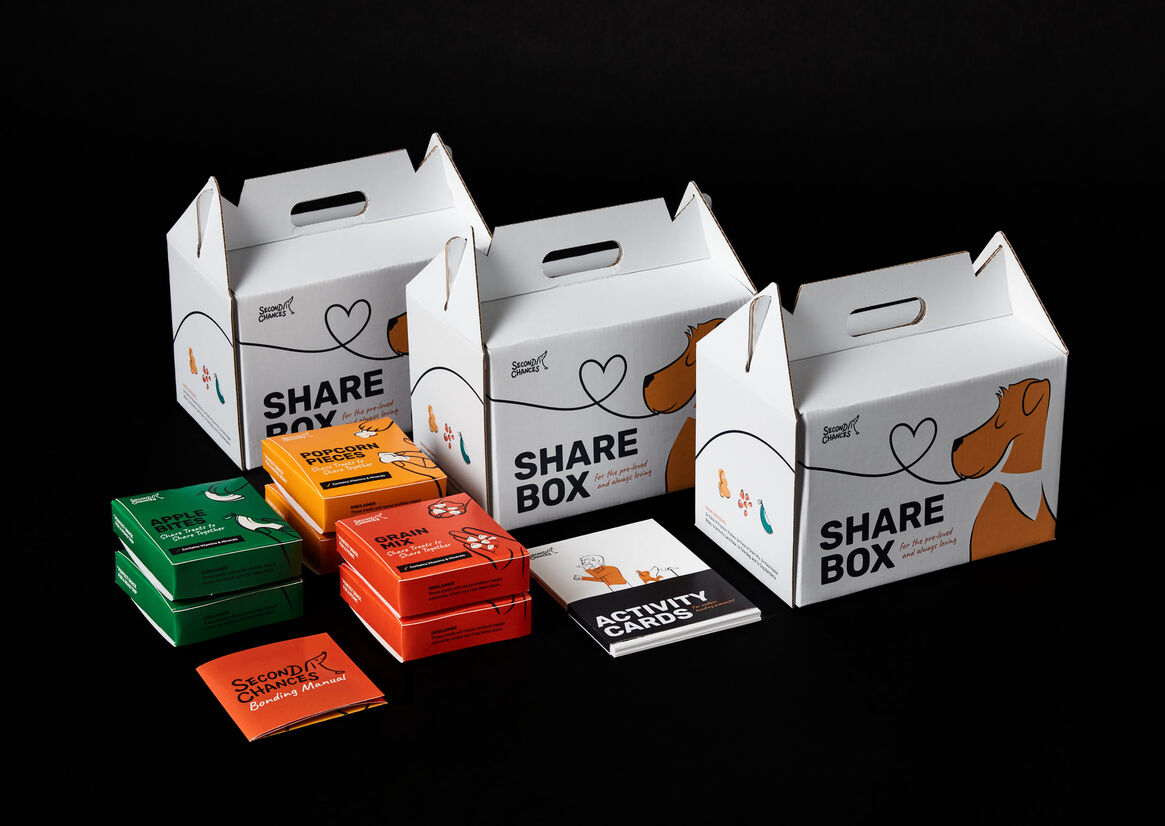 Second Chances Share Box is a bonding kit for an owner and their new, previously owned dog, providing them with ways of bonding and strengthening their connection with one another, similar to ways in which humans would, over food and activities.