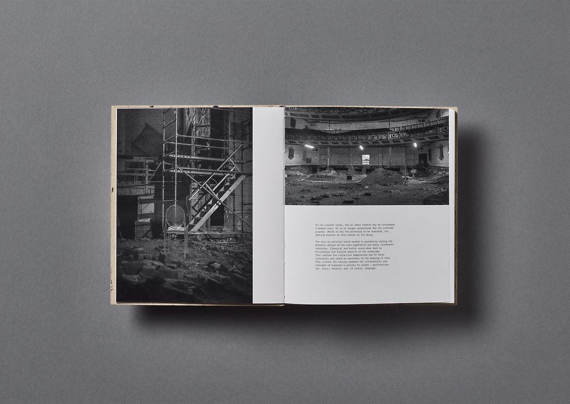 St explores the relationship between letterforms and place. It embraces the romanticism historically associated with ruins as liminal spaces. St is a creative response to the ruin, centred around letterforms which emphasise the eerie through the interplay of negative and positive space. This decorative alphabet is supported by a publication which investigates the history of the St James Theatre and its current derelict state using documentary photography and archival materials. St integrates text, image and storytelling, to create a new iconography which elevates letters to the Sublime, alongside architecture and other artforms which the St James Theatre represents.