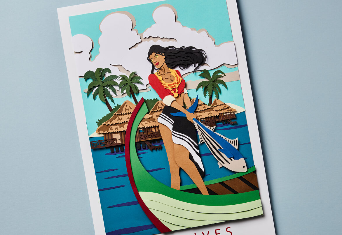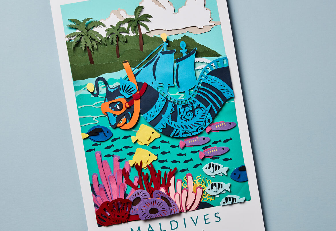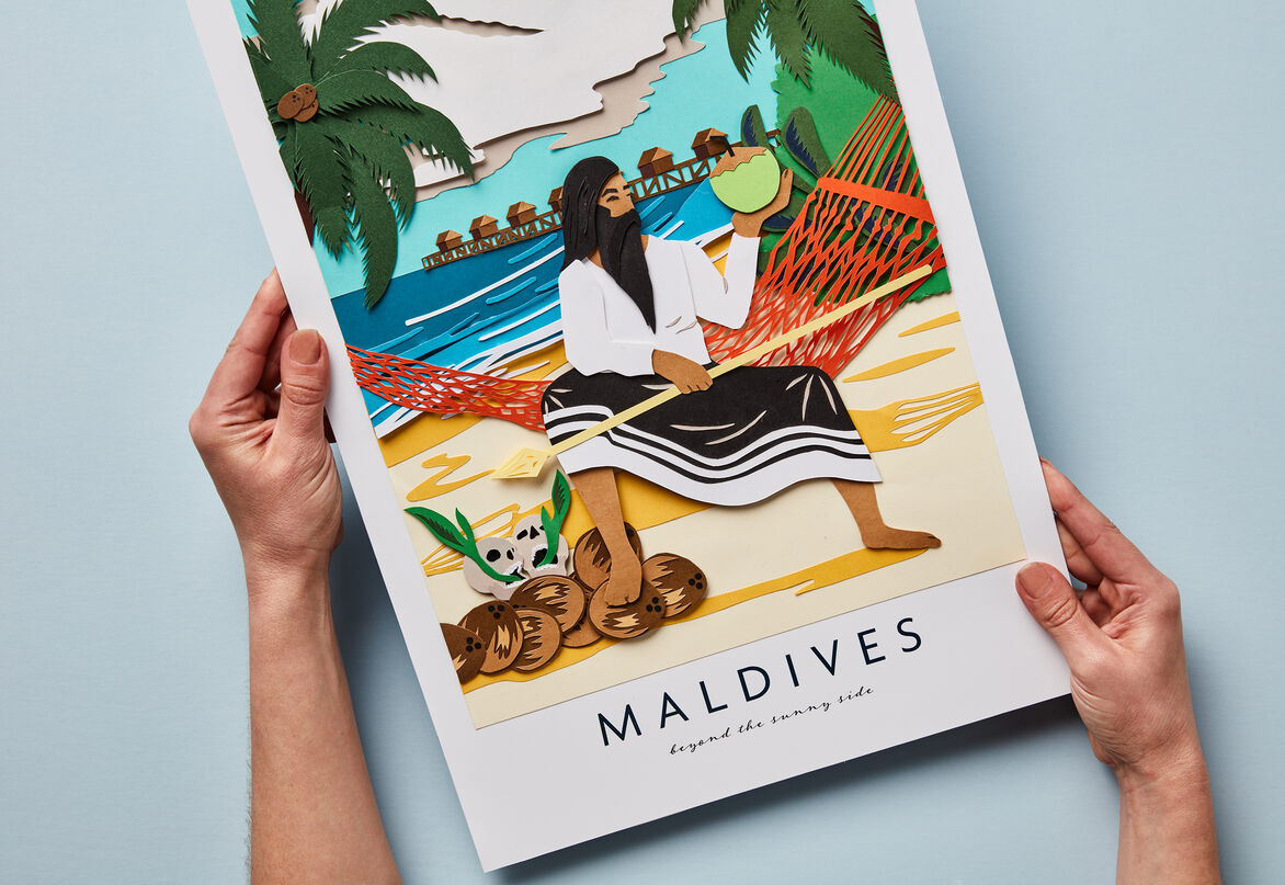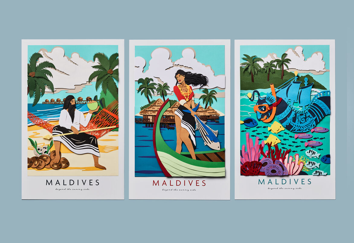 The design of the book takes inspiration from publications made in Maldives. This includes use of strong visuals, vibrant colours, and hand drawn type. The posters were inspired by old vintage travel posters that portrayed scenic images of different countries and places. Similar images taken of Maldivian tourist resorts were used and added the characters from the folklore into these scenes. I wanted to combine the idea of tourism culture with the more traditional culture of Maldives to show how the country is not just one thing, but a combination of both. I also used layers of coloured paper stacked on top of each other to create the posters, because I wanted to add to the concept of revealing the deeply rooted layers of Maldivian culture.