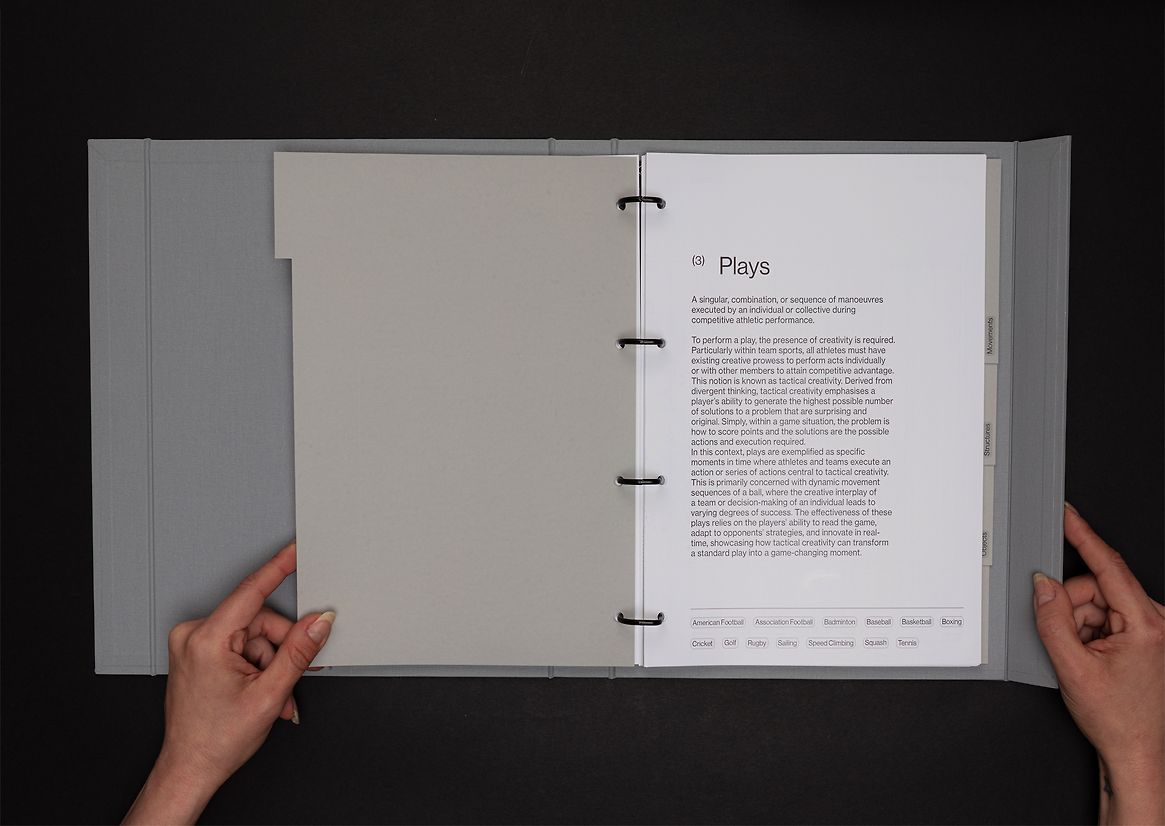 In contemporary sporting culture, creativity is often confined to traditional definitions of artistic practice, leaving the strategic and expressive elements of sport overlooked. The Playbook addresses this gap by reimagining sport through the lens of visual communication. The project positions design to analyse, interpret, and present the inherent creativity found within athletic environments— bridging the gap between two seemingly separate worlds.