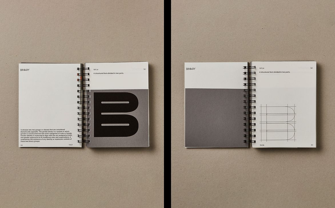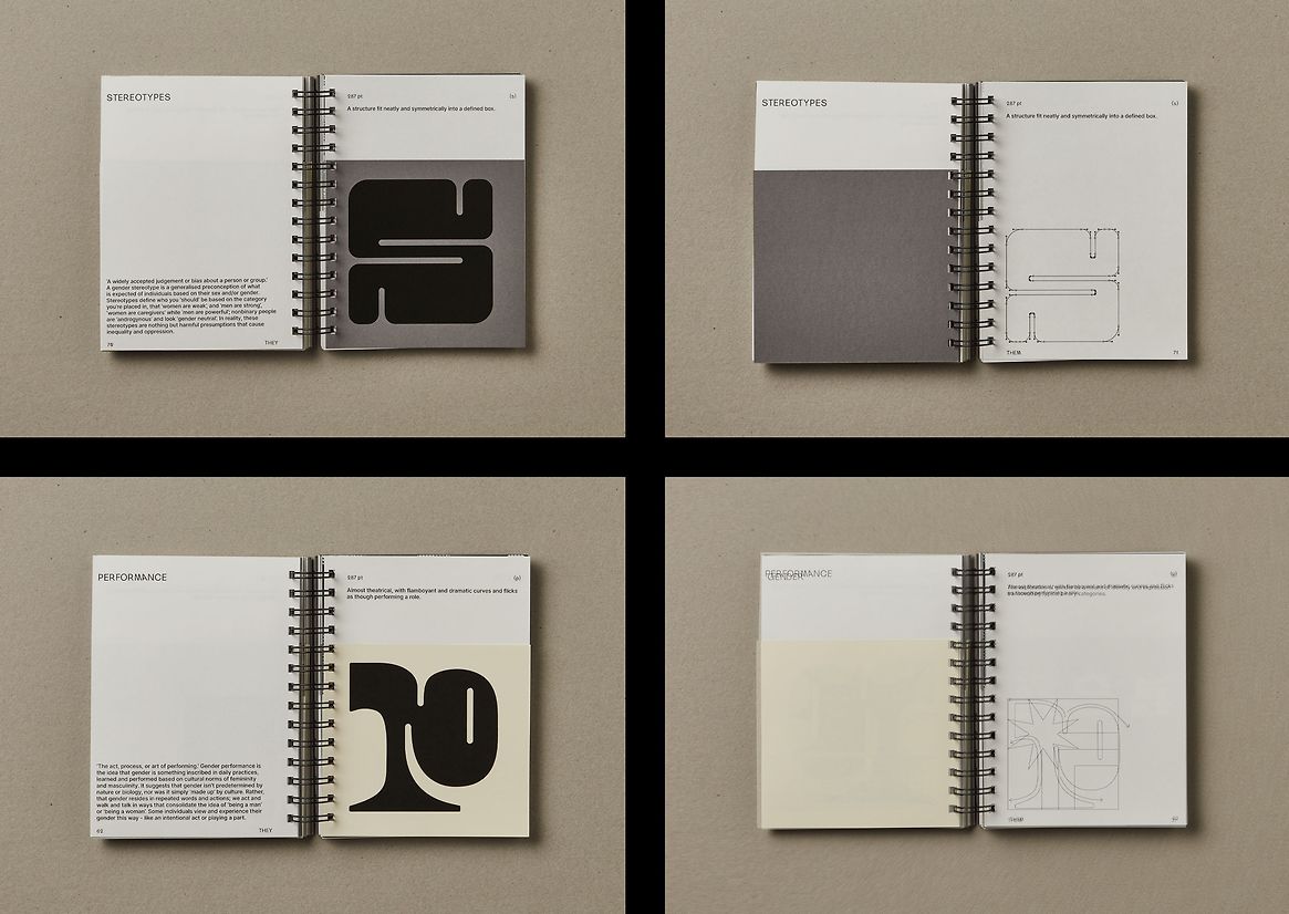 ‘They Them’ is a typeface that exists outside of the binary. It is an exploration into the realm of nonbinary gender identity, and the space that sits between two halves. It discusses gender as a mode of expression; malleable to your sense of self rather than defined by your anatomy. Through the alphabet, each letter depicts an element of identity surpassing the categories of ‘male’ and ‘female’. The result is a typeface that acts as a taxonomy of gender beyond the binary.