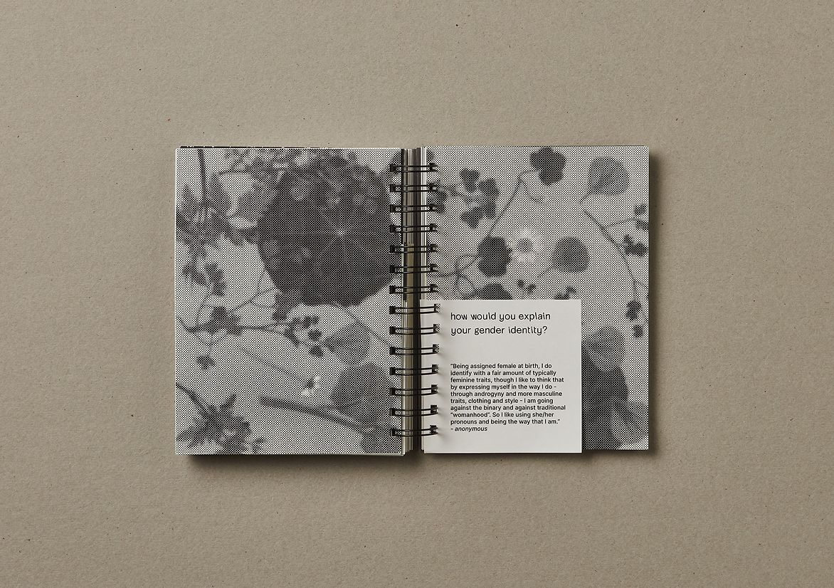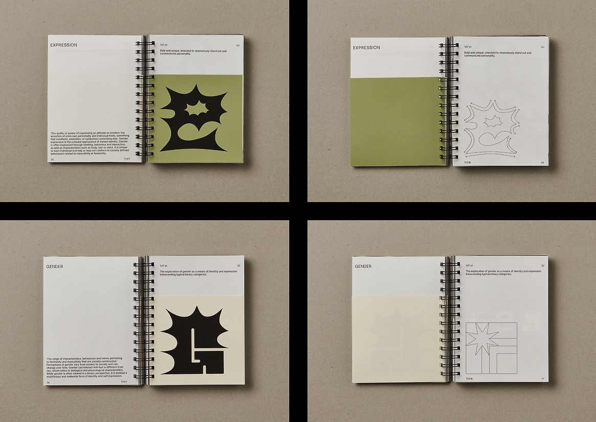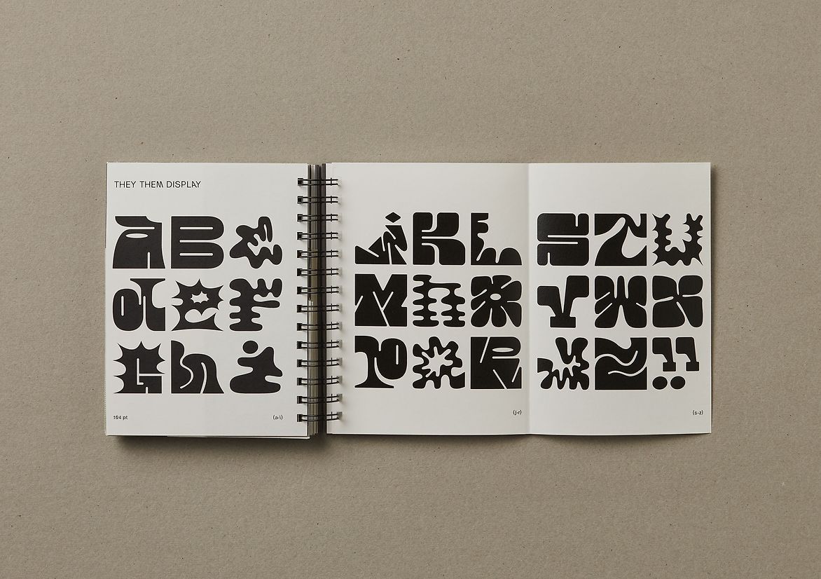 Binary constructs and systems are creating a barrier between groups by erasing the space inbetween for their shared experiences and characteristics. Erasing the middleground and disregarding the complexities of personal identity is in turn erasing the existence of individuals who don’t align with these binary roles. In order for ‘They Them’ to be reflective of this nonbinary space, I undertook a heuristic research approach and opened a dialogue on the topic of gender with 27 individuals of varying gender identities. Their thoughts, experiences, understandings and perceptions laid the basis for this project. Themes of fluidity, bold expression, creativity, constructs, nature and organic colours are woven into the letterforms and materiality.