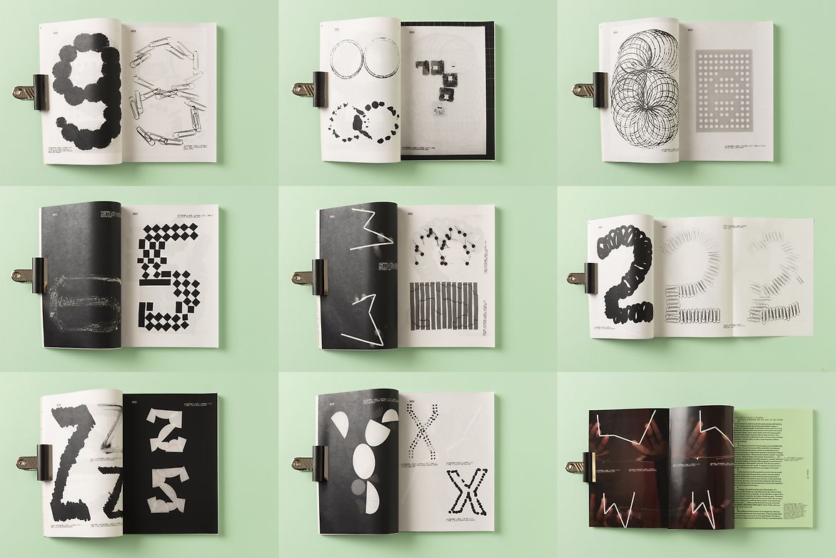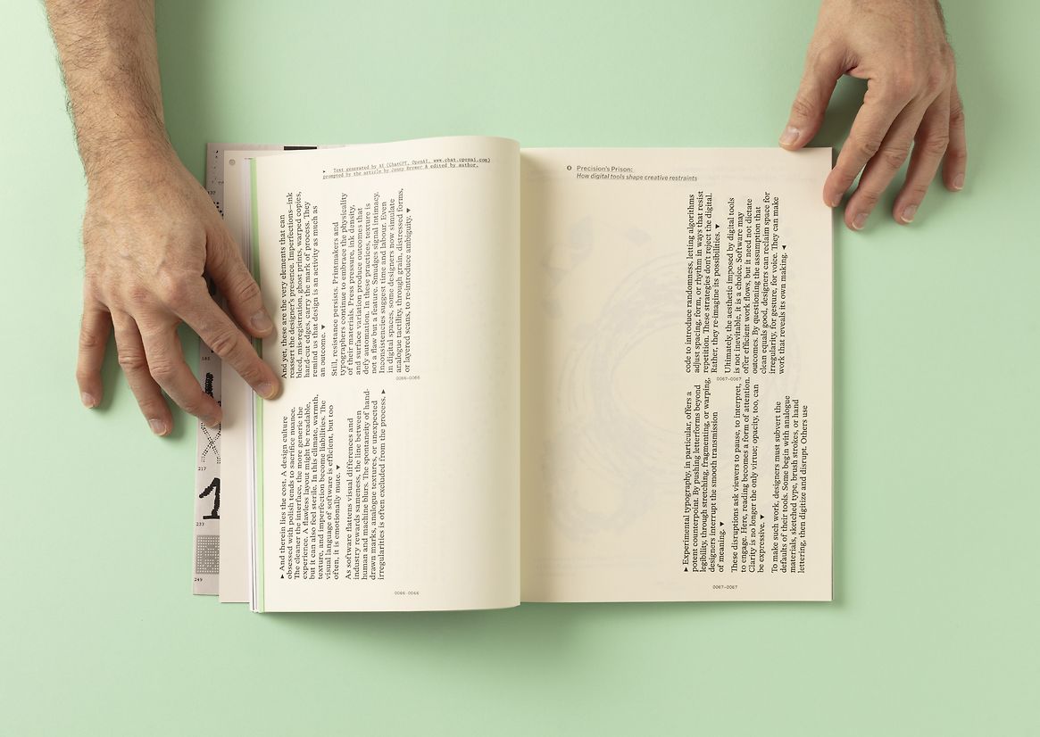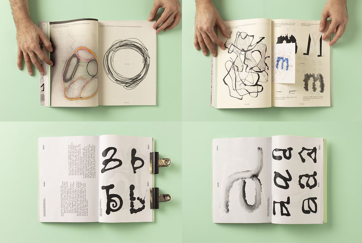 Within the layout, tension is played out between rigid grids containing the analogue letterforms and digitally set text that is intentionally irregular and “wonky.” This contrast echoes the dialogue at the heart of the project: the push and pull between perfectionism and experimentation, control and looseness, digital and analogue.