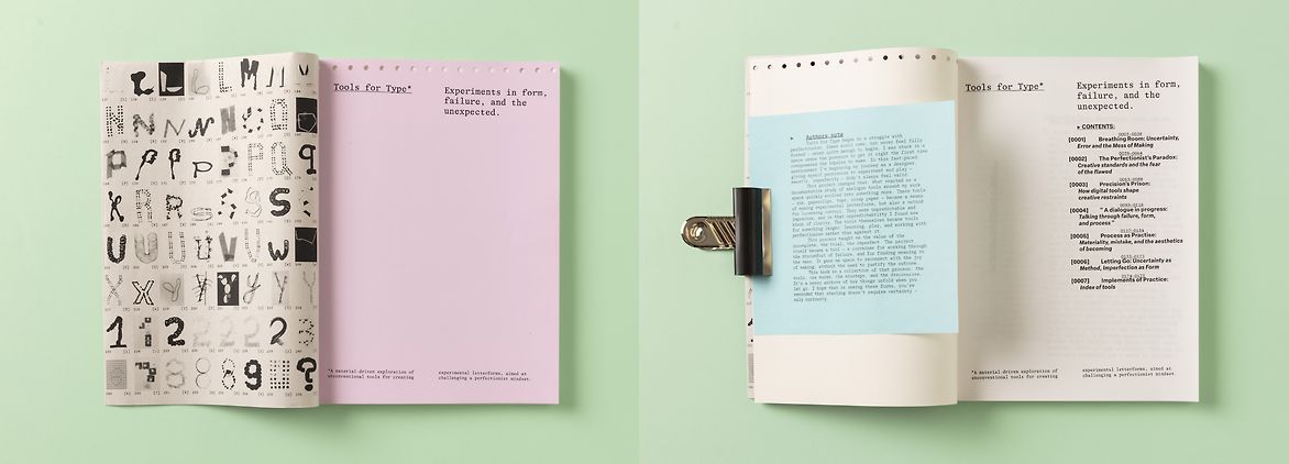 ‘Tools for Type’ explores the creative tension between experimental typography and the restrictive effects of perfectionism. This publication responds to a common challenge faced by many designers: the paralysis that arises from striving for flawless work before even beginning. The project was an opportunity to rethink this mindset by embracing imperfection, failure, and process as essential and valuable parts of creative practice.
