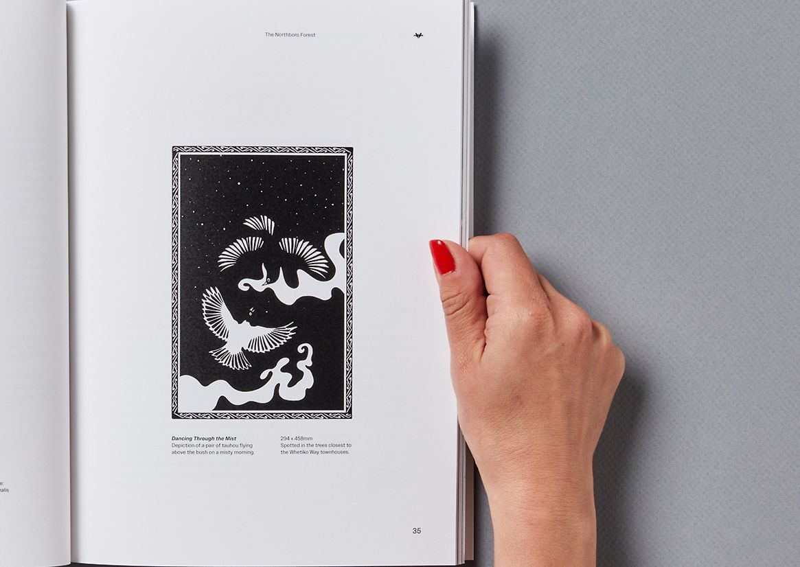 The illustrations themselves are displayed and titled as ‘plates’, and inspired by the techniques of lino printing & border design seen in traditional artbooks – this combined with simplicity and legibility of information evokes a timelessness in the work, making it accessible to a wide audience. In order to prioritise this accessibility, the perfect bound softcover publication is an intuitive size to flip through, large enough to allow the plates to breathe while maintaining a light format. The narrative weaves through time and place – moving the reader from myths and stories from times past, to gods which uplifted the land and formed volcanos, through forest and shore and into the future. It is a celebration of the resilience of life in Northboro Reserve, of the knowledge passed on to us by our ancestors, and of the magic which is around us, if we just take enough care to look closer.