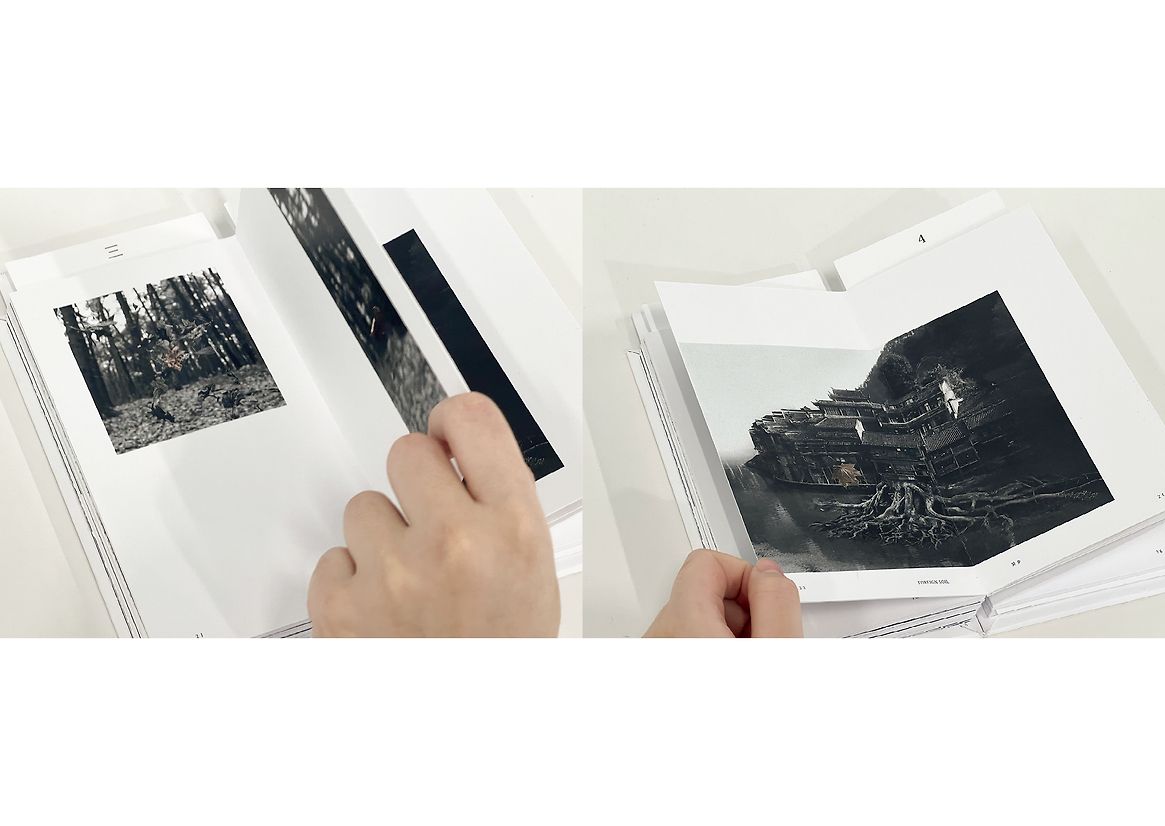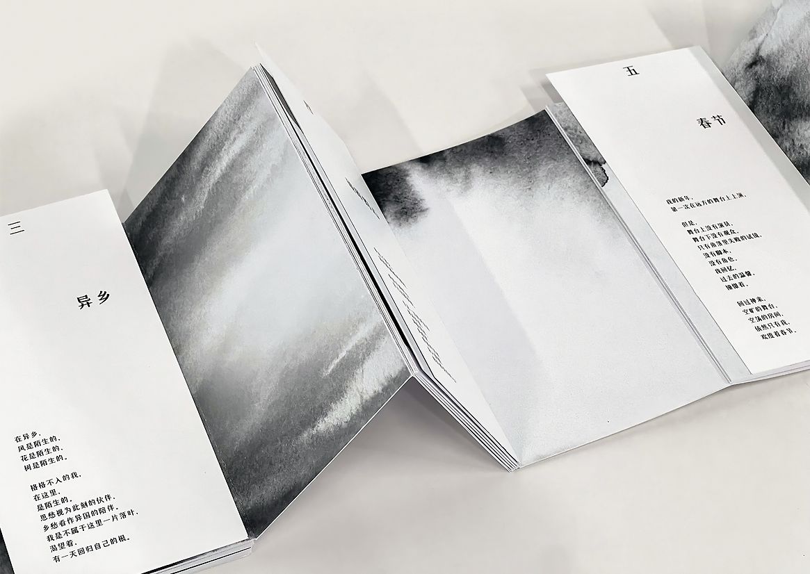 The fictional student’s final university project – ‘Poems of Exile’ demonstrates a quiet, sophisticated design sensibility that becomes a subtle expression of solitude. Each poem appears on a separate card. As interior voices, the cards serve as bookmarks, interleaving sections of the document so that they may be taken out and read before being discreetly returned. Structurally, the work employs a concertina binding that accommodates the reclusive spaces for the poems and a linear order for the photographs.