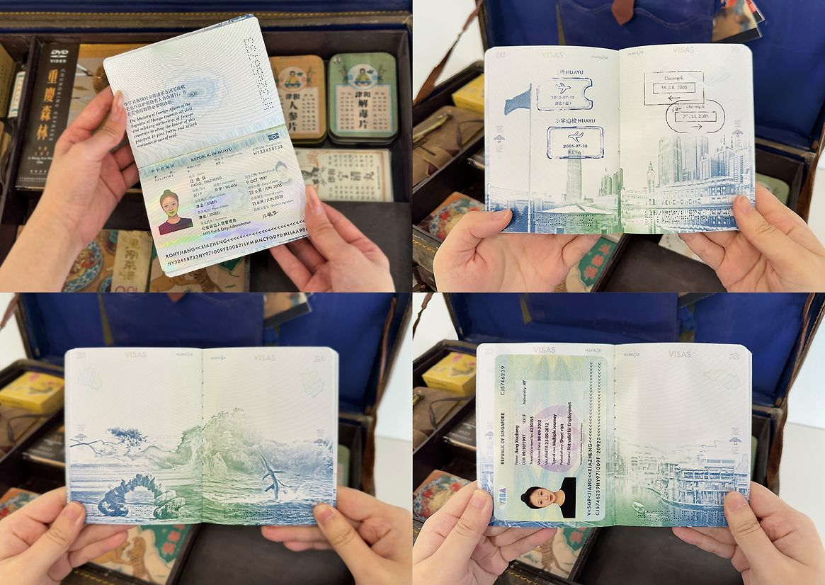In the passport design, the designer replicated security details, anti-counterfeiting systems and colour transitions. She also created entry and exit stamps and visa stickers for different countries. The use of linen textured stock, gold foil and laser cold lamination film replicates the look and feel of a real passport. A sense of nostalgic to national identity was developed in the interior design of the artefact. In her engagement with aisthetic (sensory) design, the designers explored material fatigue, varying paper weight, print quality, decay, texture and scent, to provide a direct and perceptible experiences designed to convey information and resonance.