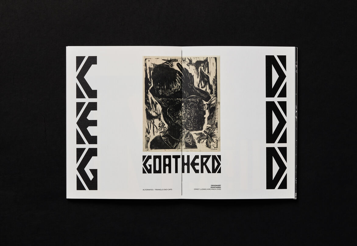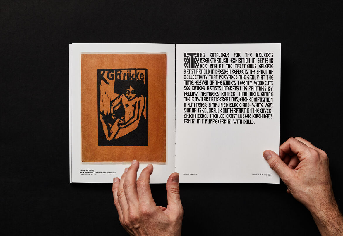 A new set of drop caps are also embedded within the typeface as alternate characters. These took primary influence from the decorative patterned borders found in Die Brücke’s 1910 exhibition catalogue.
