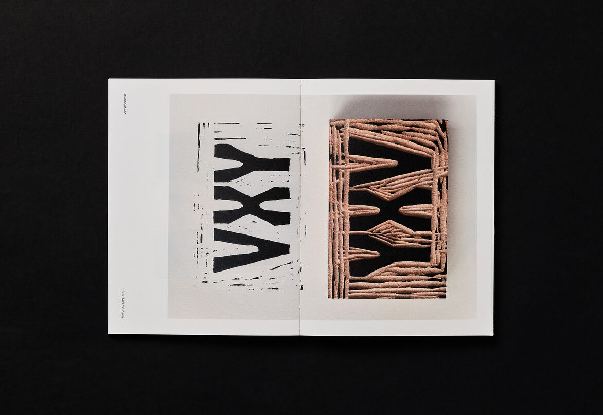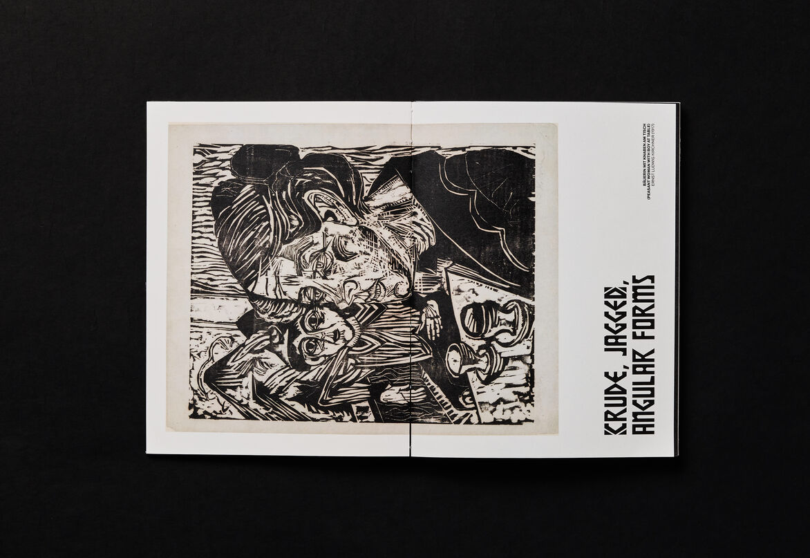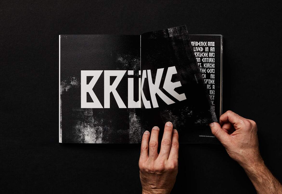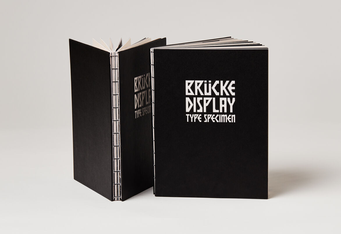 The type specimen book also became an important medium to showcase Brücke Display as it presented an opportunity to appreciate the original woodcuts by Kirchner. The use of rolled ink textures overlaid on top of numerous spreads create and complement an analogue quality that connects these type forms to printmaking, as do the scanned woodcut prints of Brücke Display over several typographic layouts.