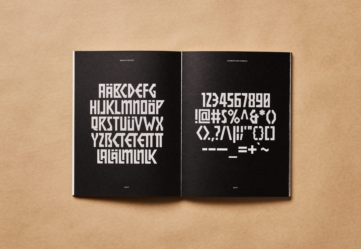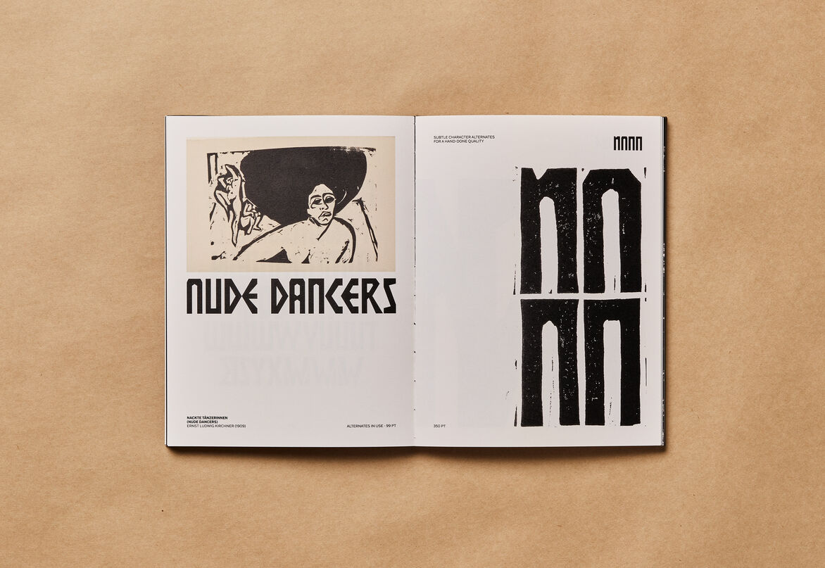 Although constructed in a digital space, Brücke Display endeavours to stay true to the original manifesto by taking visual cues from the sharp angular forms and interlocking triangular shapes. Formed on the foundation of three basic shapes, it aims to embody the nuances, physicality and crude qualities of the woodcut print by honing in on the brutal effects of wood-gouging and carving motions. As a result, the letterforms retain a hand-made feel for a sense of authenticity, most notably through tapered counters (for example, the ‘X’) that mirror the effects of woodcutting, and also through an alternate character set with subtle differences between letterforms that allude to the imperfect motion of the hand.