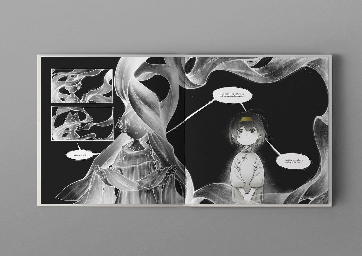 In the process of analysing myself and studying the historical context behind Chinese parental expectations, I came to understand the Chinese parents' concept of "loving their children and planning for their future." I realised that my goal is not to rebel against my parents but to find a way to preserve my desires. Through Ghost Talk, I reflected on my memories, fragmenting myself into characters from different periods of my life and cultural background with varying perspectives. I shifted angles between ghosts to observe my growth and my questioning under parental expectations. By means of the metaphorical enactment of these characters, I staged an internal debate within myself and eventually found an answer: even if I cannot change the environment, I still understand my family while not giving up on myself wishes, thus no longer feeling lost. I'm inspired by the Eastern Jin (367-427) hermit Tao Yuanming's thought "心远地自偏, " meaning "I remain undisturbed by my surroundings because my soul is far from the noise". In doing so, I hope my story will strike a chord with those who have undergone similar situations in their life.